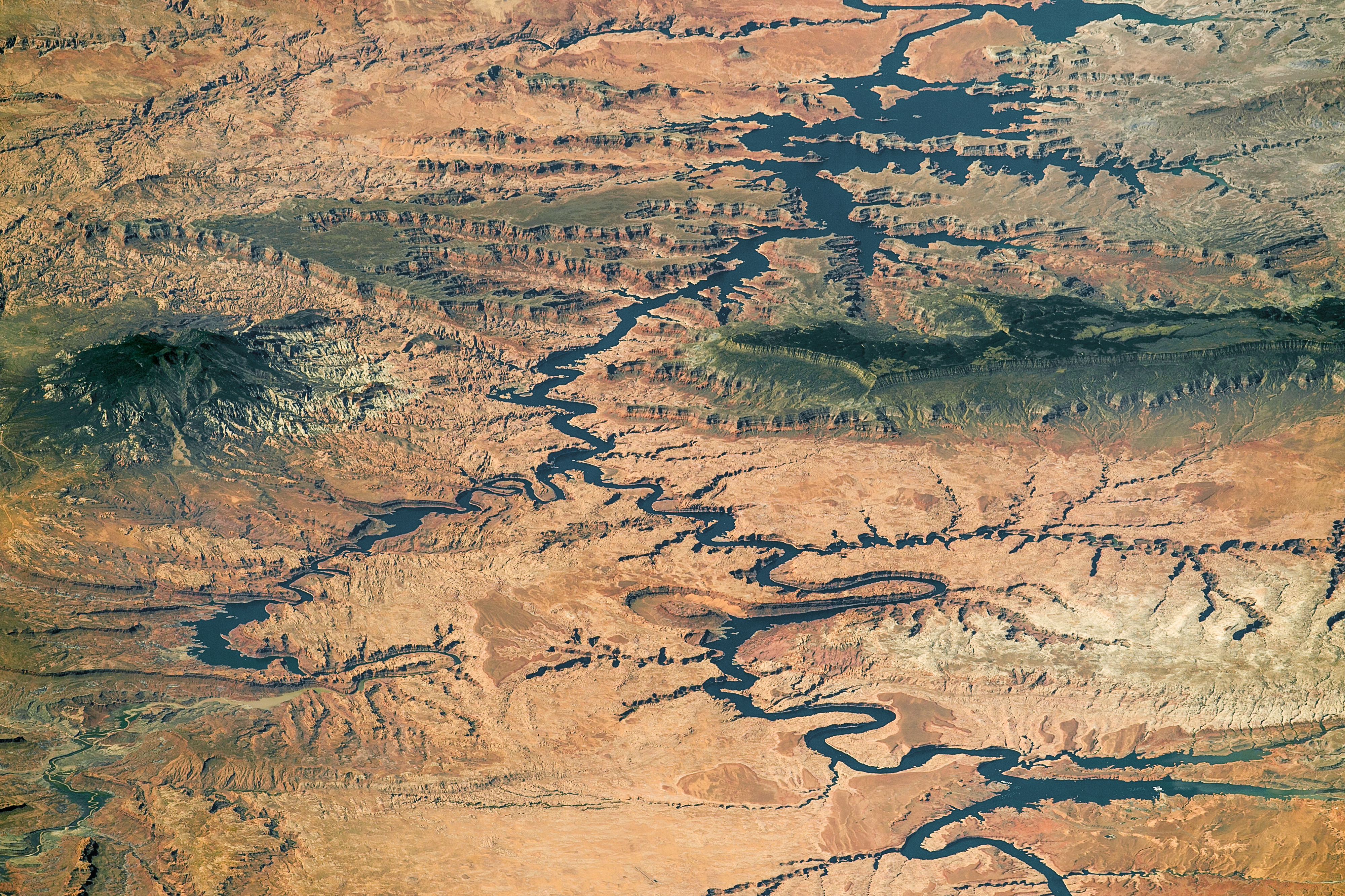 This panorama, photographed by an astronaut aboard the International Space Station, shows nearly the full length of Lake Powell, the reservoir on the Colorado River in southern Utah and northern Arizona. Note that the ISS was north of the lake at the time, so in this view south is at the top left of the image.
