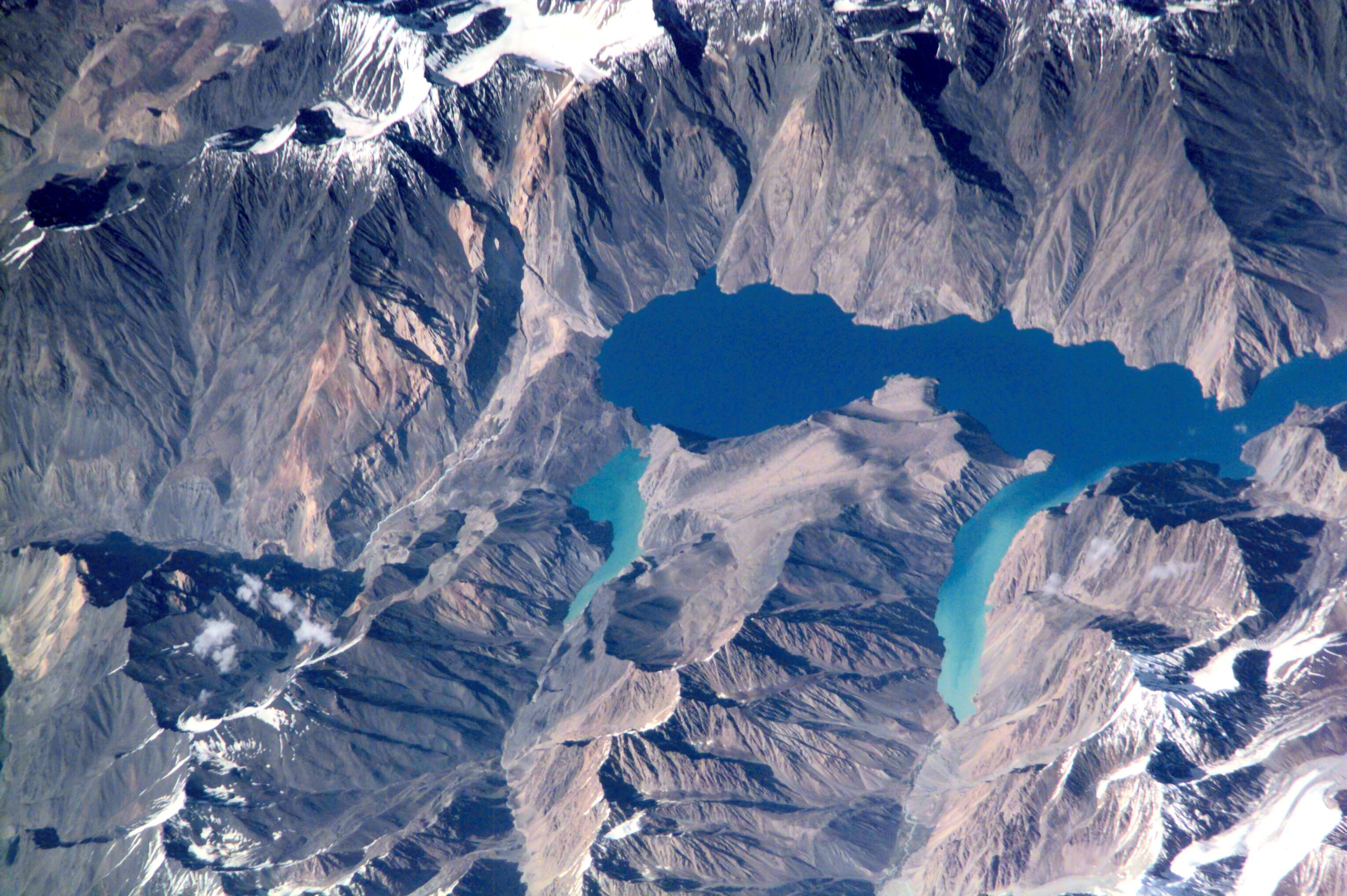 Lake Sarez (top), deep in the Pamir mountains of Tajikistan, was created 90 years ago when a strong earthquake triggered a massive landslide that, in turn, became a huge dam along the Murghob River, now called the Usoi Dam. The resulting lake is perched above surrounding drainages at an elevation greater than 3000m, and is part of the watershed that drains the towering Akademi Nauk Range (see the regional image, lower). The lake is 61 km long and as deep as 500 m, and holds an estimated 17 cubic km of water. The area experiences considerable seismic activity, and scientists fear that part of the right bank may slump into the lake, creating a huge wave that will top over and possibly breach the natural dam. Such a wave would create a catastrophic flood downstream along the Bartang, Panj and Amu Darya Rivers, perhaps reaching all the way to the Aral Sea. Currently, central Asian governments, as well as the World Bank and the UN are monitoring the dam closely, and have proposed gradually lowering the lake level as a preventive measure.