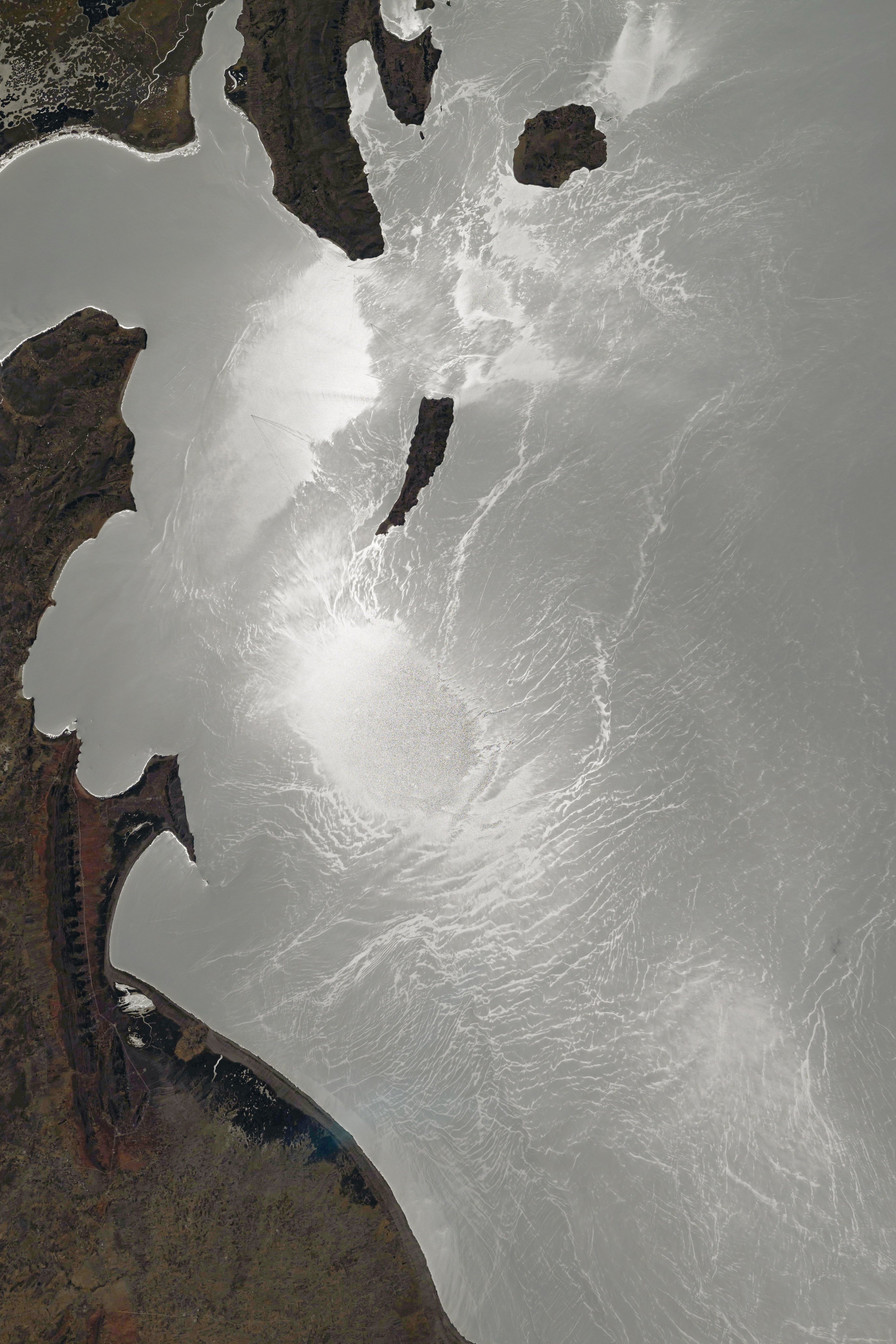 Other features made visible from space by sunglint are internal waves. These waves develop at depth within a body of water and have amplitudes of meters, but they appear on the water’s surface as waves of very low amplitude. In sunglint, surface waves appear as bright parallel lines. Bathymetric maps of Lake Titicaca indicate that the set of internal waves in this image occurred where deeper water flows against an underwater cliff-like feature at a depth of 20-50 meters (65-165 feet) near the shore of the lake.