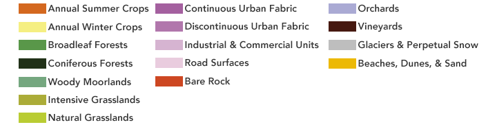 In this way, the scientists could differentiate between 17 different land cover types. Classifications include a range of artificial areas, including places where people have built up cities and transportation infrastructure. They could also distinguish between types of agricultural areas, and forested and semi-natural areas.