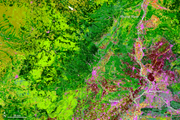 The map above is the result of the new, automated approach. This map combines data from all images of France acquired in 2014 by the Operational Land Imager (OLI) on the Landsat 8 satellite. A computer program first detects and removes artifacts such as clouds, and then a classification technique is applied to the remaining data to generate a map in less than 12 hours.