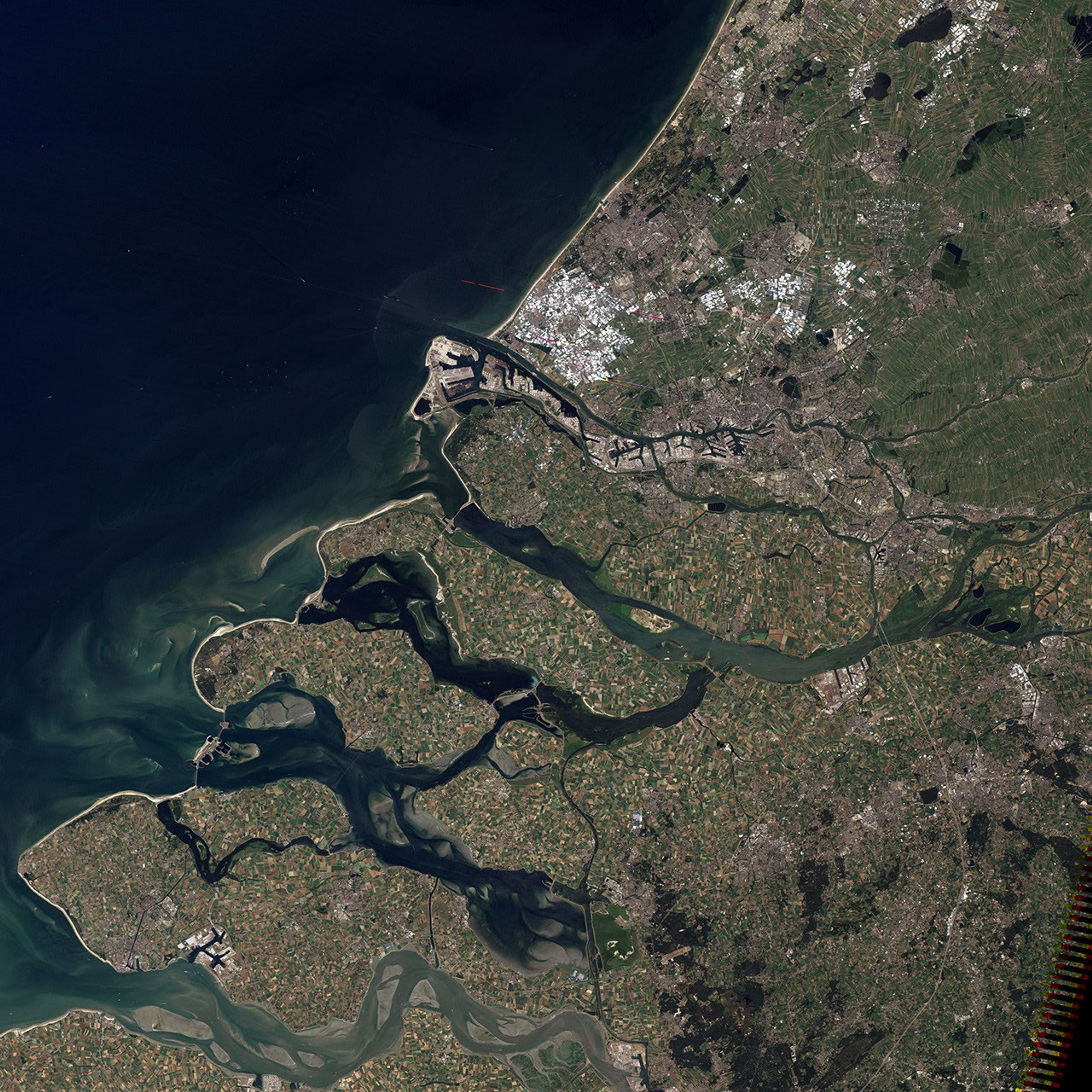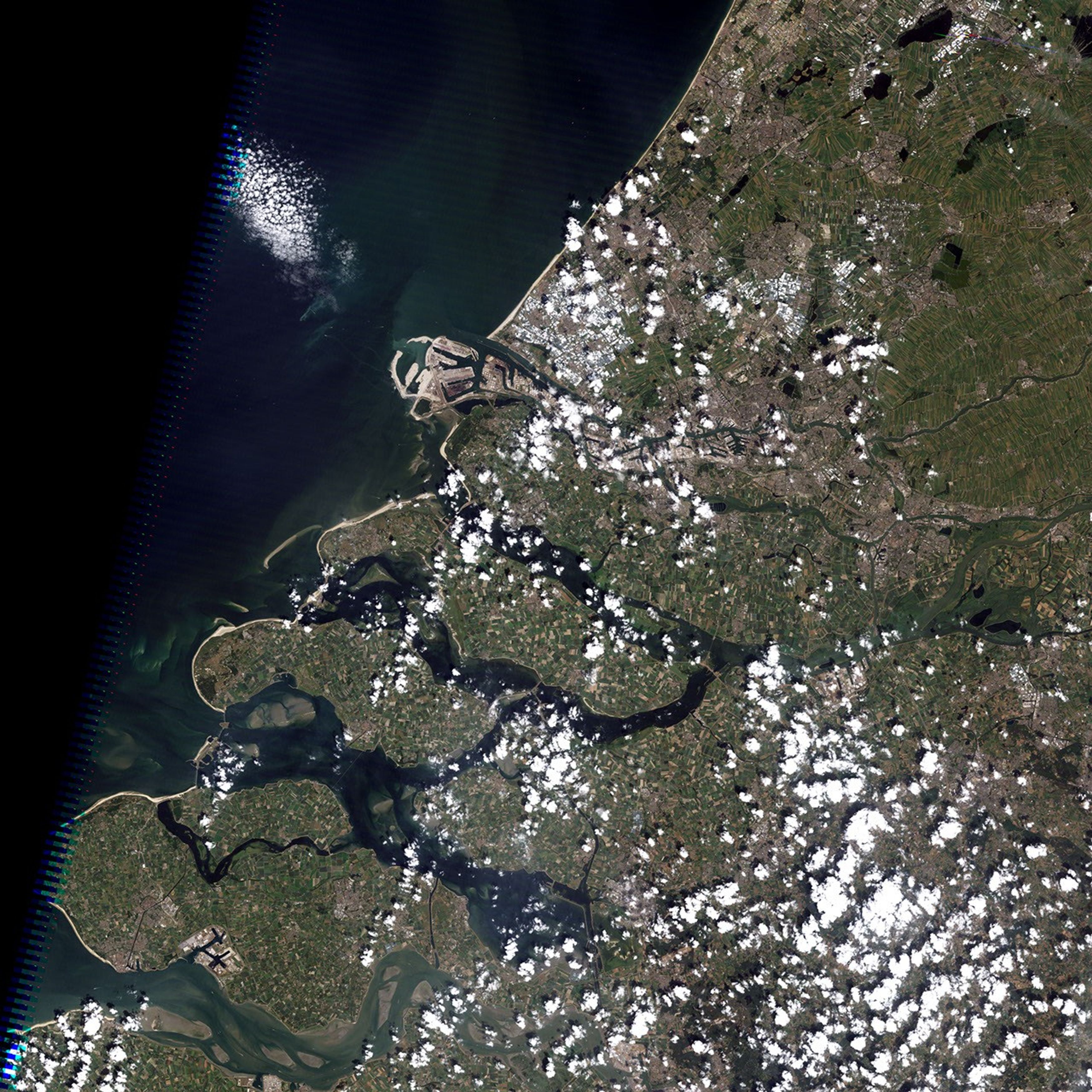 A large-scale application of land reclamation has occurred at Rotterdam. Originating as a fourteenth-century settlement along a small peat river, Rotterdam eventually grew into Europe’s largest seaport. By 2009, 400 million tons of cargo traveled through the port, but Rotterdam was nearing its capacity. To keep the port competitive, authorities undertook an ambitious project aimed at tripling the port’s capacity. The Landsat 5 satellite observed the port’s expansion on July 16, 2006 (top), July 1, 2009 (middle), and July 4, 2010 (bottom).