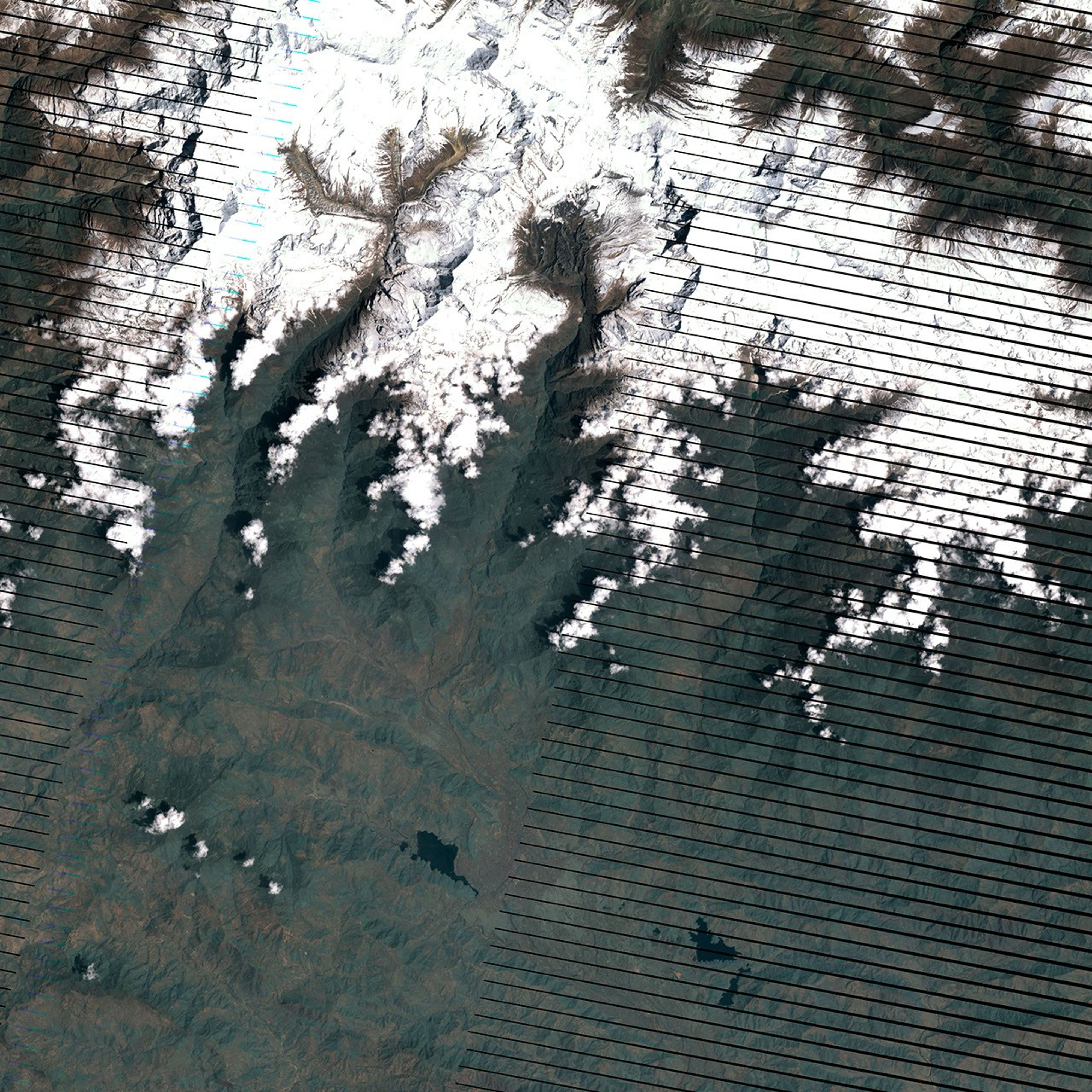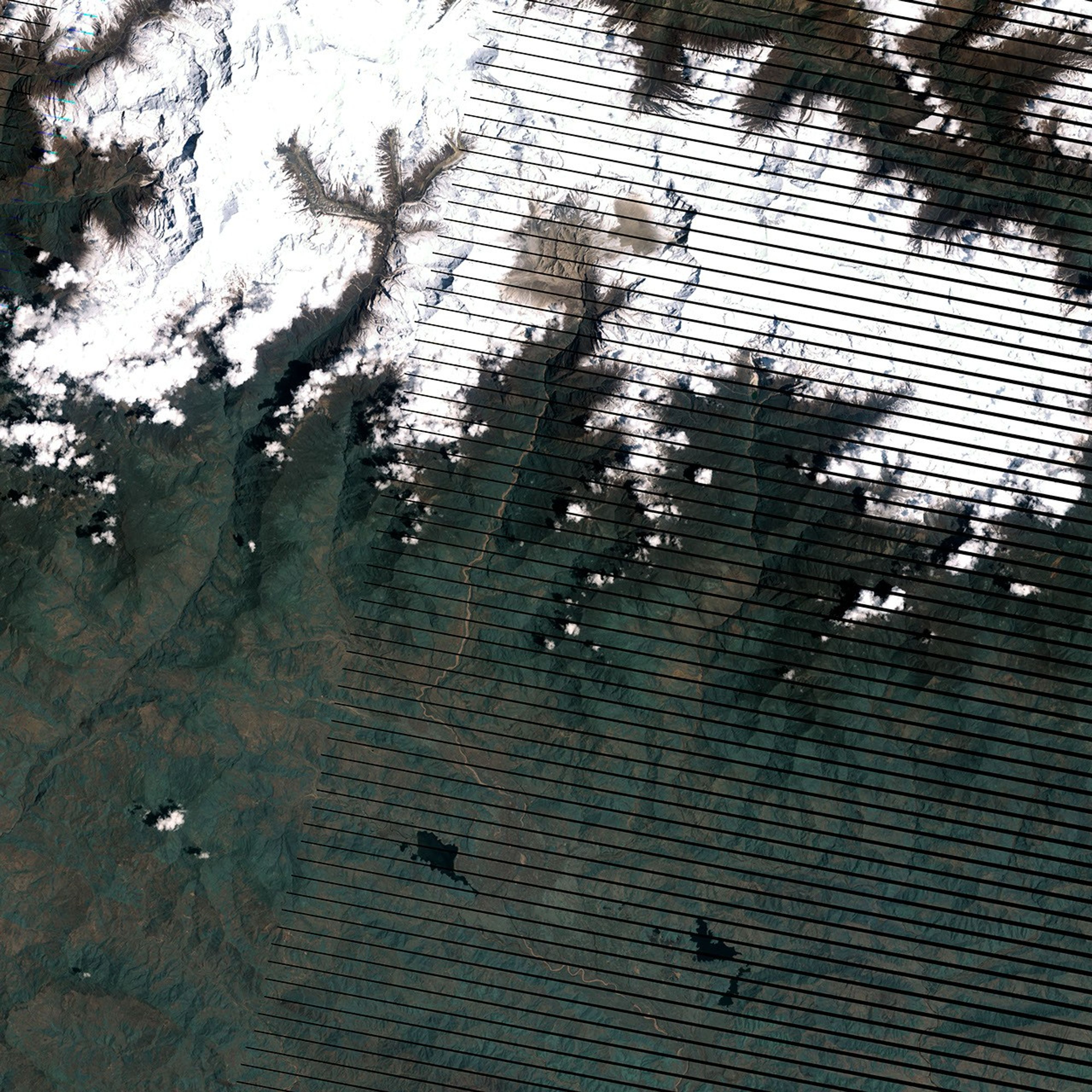 The Enhanced Thematic Mapper Plus (ETM+) on the Landsat 7 satellite observed the region before and after the landslide and flood. The top image shows the area on May 6, 2012, roughly 25 hours after the landslide. For comparison, the bottom image shows the same area on April 20. Both images are natural color. The diagonal lines are gaps in the data, resulting from a partial failure of the satellite.