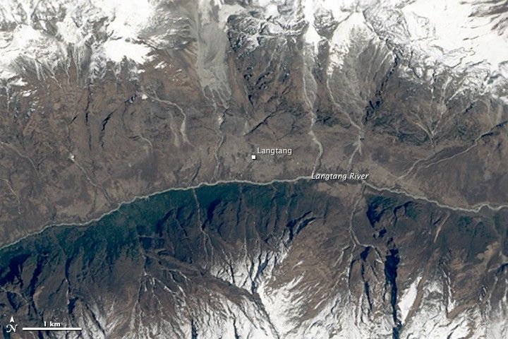 While cloudy conditions have hampered satellite observations of Nepal since the earthquake, the Operational Land Imager (OLI) on Landsat 8 captured a clear view on April 30, 2015. A mixture of snow, ice, and debris—which originated in snowfields on the slopes above Langtang—slid toward the Langtang River and buried the village.