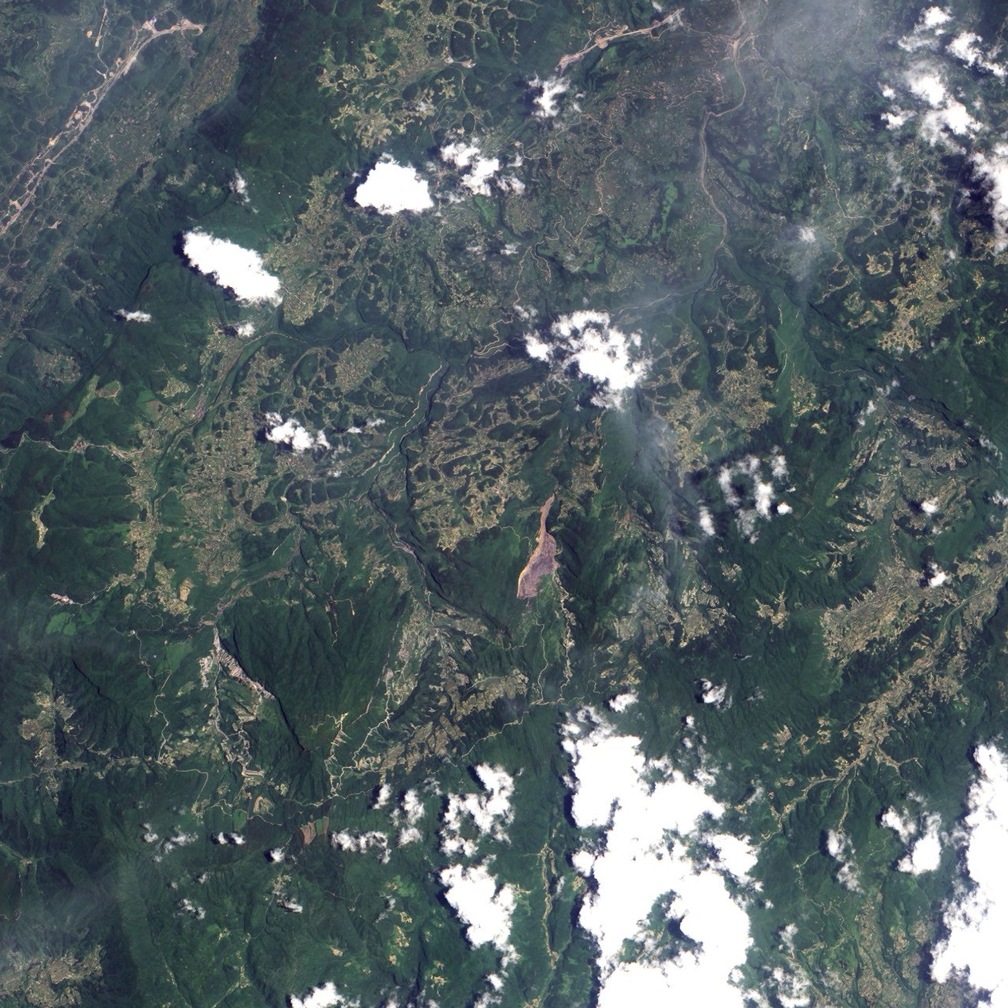 The Advanced Land Imager (ALI) onboard NASA’s Earth Observing-1 (EO-1) satellite captured this photo-like image of the landslide on June 17, 2009. Mountain ridges run generally north-south through this area, and the June 5 landslide occurs on the eastern slope of the middle ridge shown in the image. A giant brown scar of bare land on an otherwise vegetated landscape, the landslide fans out toward the southeast. The mountainside collapse appears to affect two roads—one road running along the top of the ridge, which borders the landslide, and another road to the east, which the landslide has partially buried.