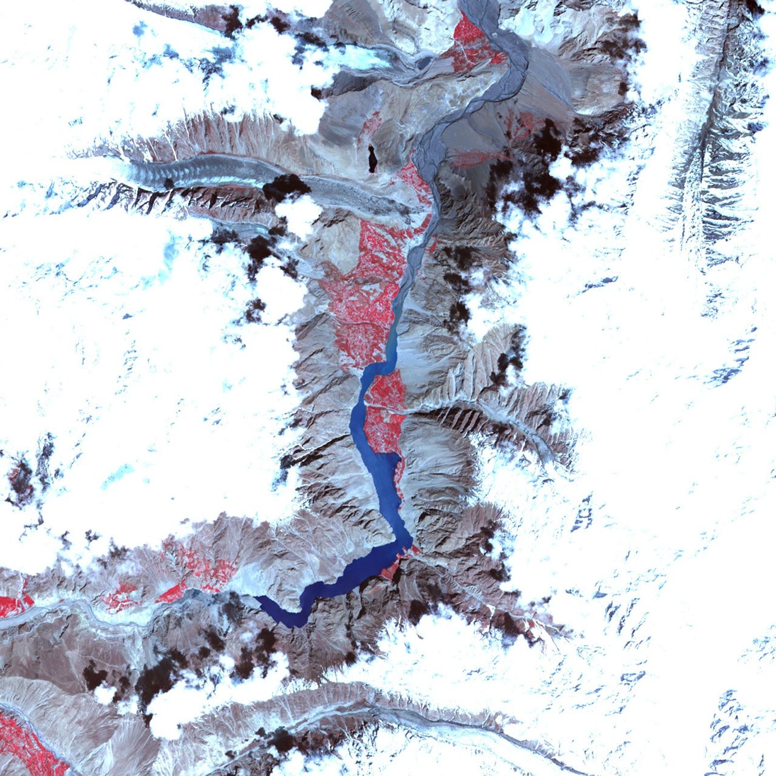Compared to the largely barren slopes nearby, low, broad plains along the river support abundant vegetation (red in this type of image) associated with settlements. Video footage of settlements along the rapidly growing landslide lake, however, shows partially submerged trees and homes, as well as residents demolishing their homes to salvage building materials.