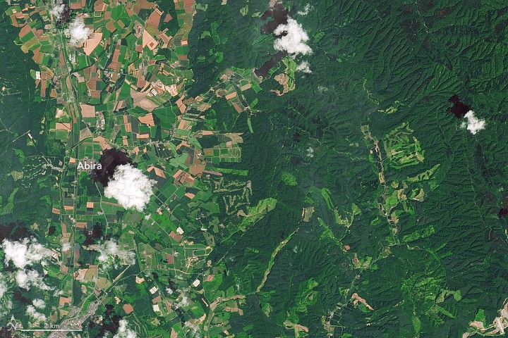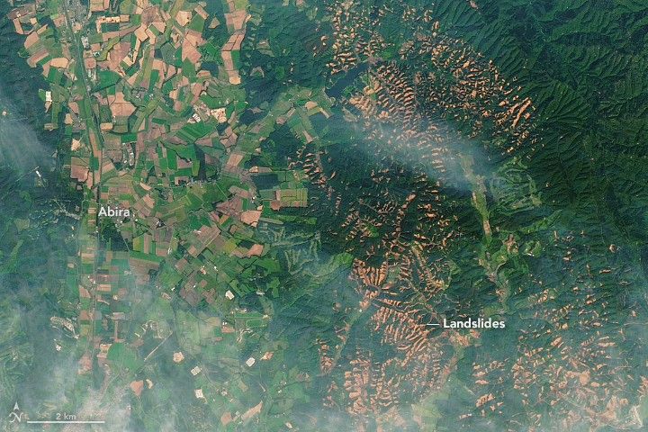 The Operational Land Imager (OLI) on the Landsat 8 satellite acquired imagery of the widespread landslides. One image, acquired on September 15, 2018, shows mud and debris in a hilly area east of Abira. For comparison, the second image shows the same area on July 26, 2017.