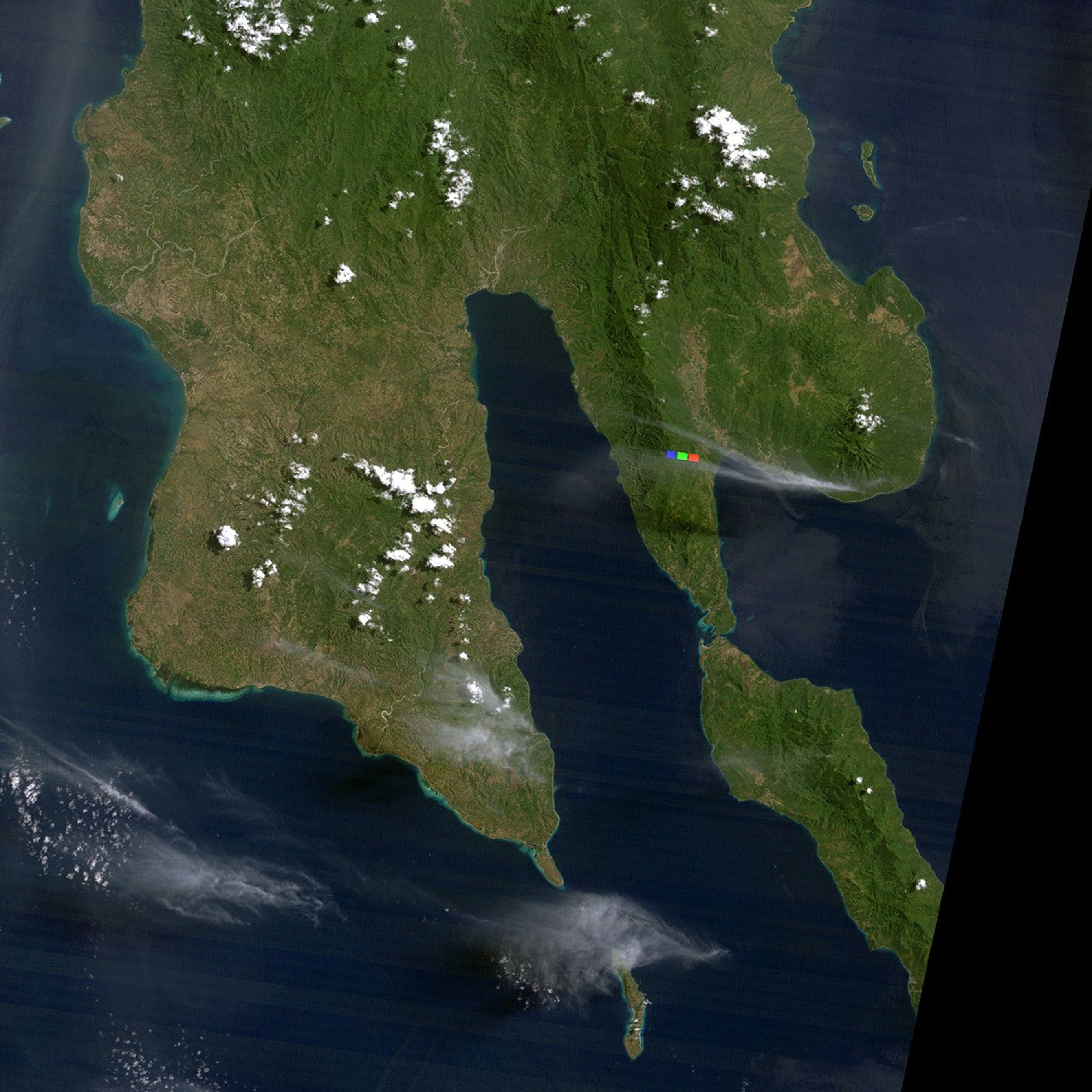 This image was acquired on June 29, 1992, by the Thematic Mapper instrument aboard NASA’s Landsat 5 satellite. Light areas in the image correspond to cleared land, green areas are vegetated, and the dark region (running from the center of the image to the lower right) is likely mature forest.