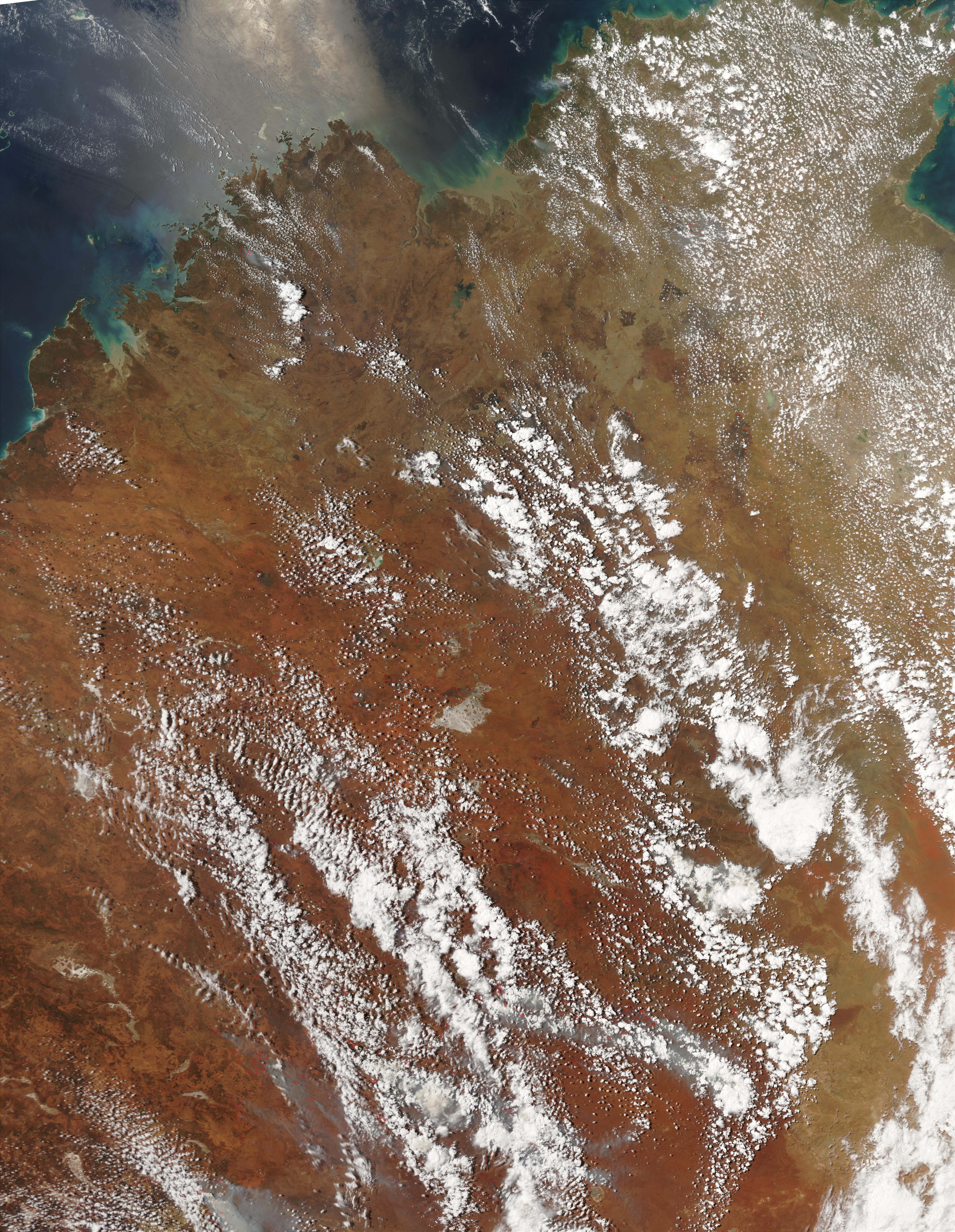 From the tropical savannas in the north, vegetation in Western Australia (left half of image) and Northern Territory (right) transitions to hot, seasonally dry grassland in the middle of the image, and finally to desert conditions in the southern part of the image. In dry conditions such as these, the arid vegetation can go rapidly up in flames due to lightning or agricultural burns. This true-color Moderate Resolution Imaging Spectroradiometer (MODIS) image captured by the Aqua satellite shows numerous large bushfires (red) burning throughout the region on November 1, 2002.