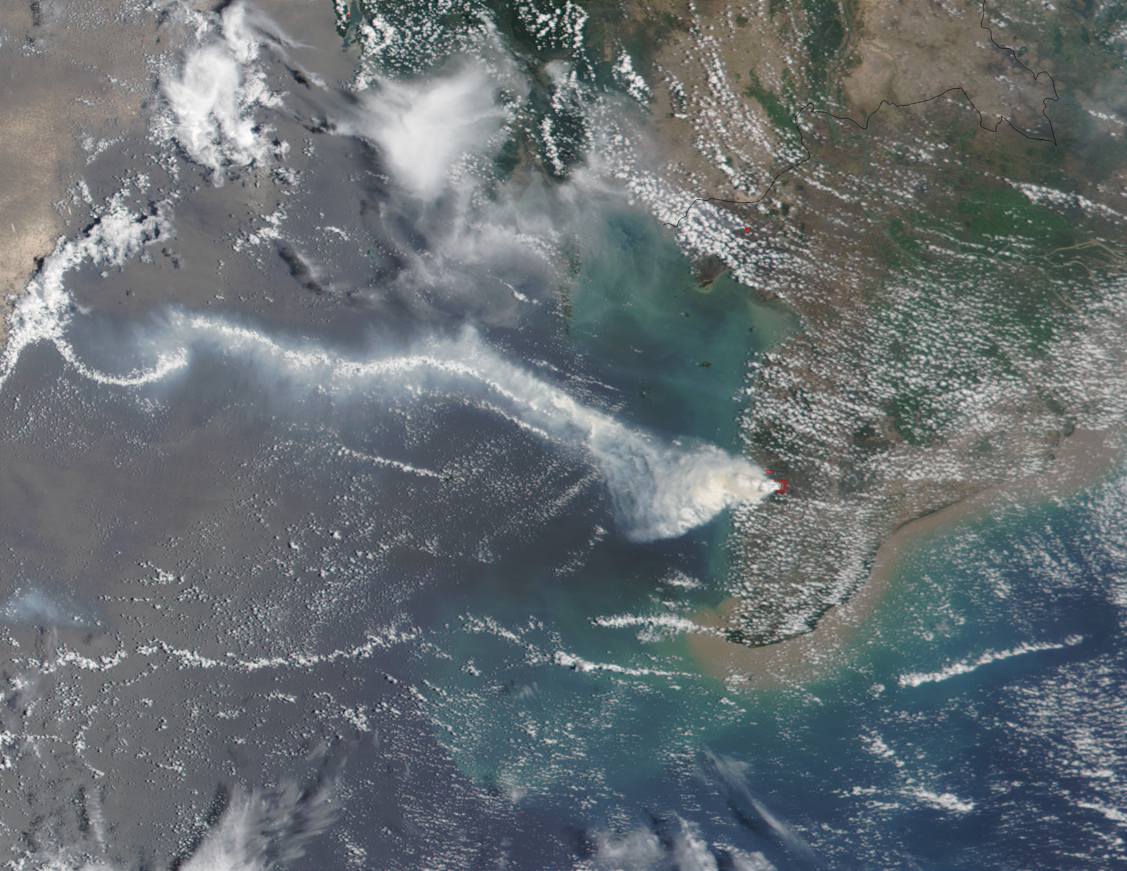 This true-color image of the fire was acquired on April 14 by the Moderate-resolution Imaging Spectroradiometer (MODIS), flying aboard NASA’s Terra satellite. The red box indicates the area affected by the fire, while its immense smoke plume (greyish pixels) can be seen blowing westward over the Gulf of Thailand.