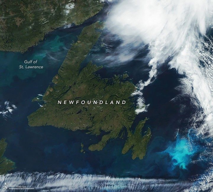 The Moderate Resolution Imaging Spectroradiometer (MODIS) on NASA’s Aqua satellite acquired these natural-color images of Newfoundland and surrounding waters on September 1 and 19, 2019. The brightest bloom appears southeast of the island, but fainter milky streaks are visible on nearly all sides. (The bloom was still visible through cloudy skies on September 22.) Note, too, the changing color of vegetation on land and the changing Sun angle as autumn set in.