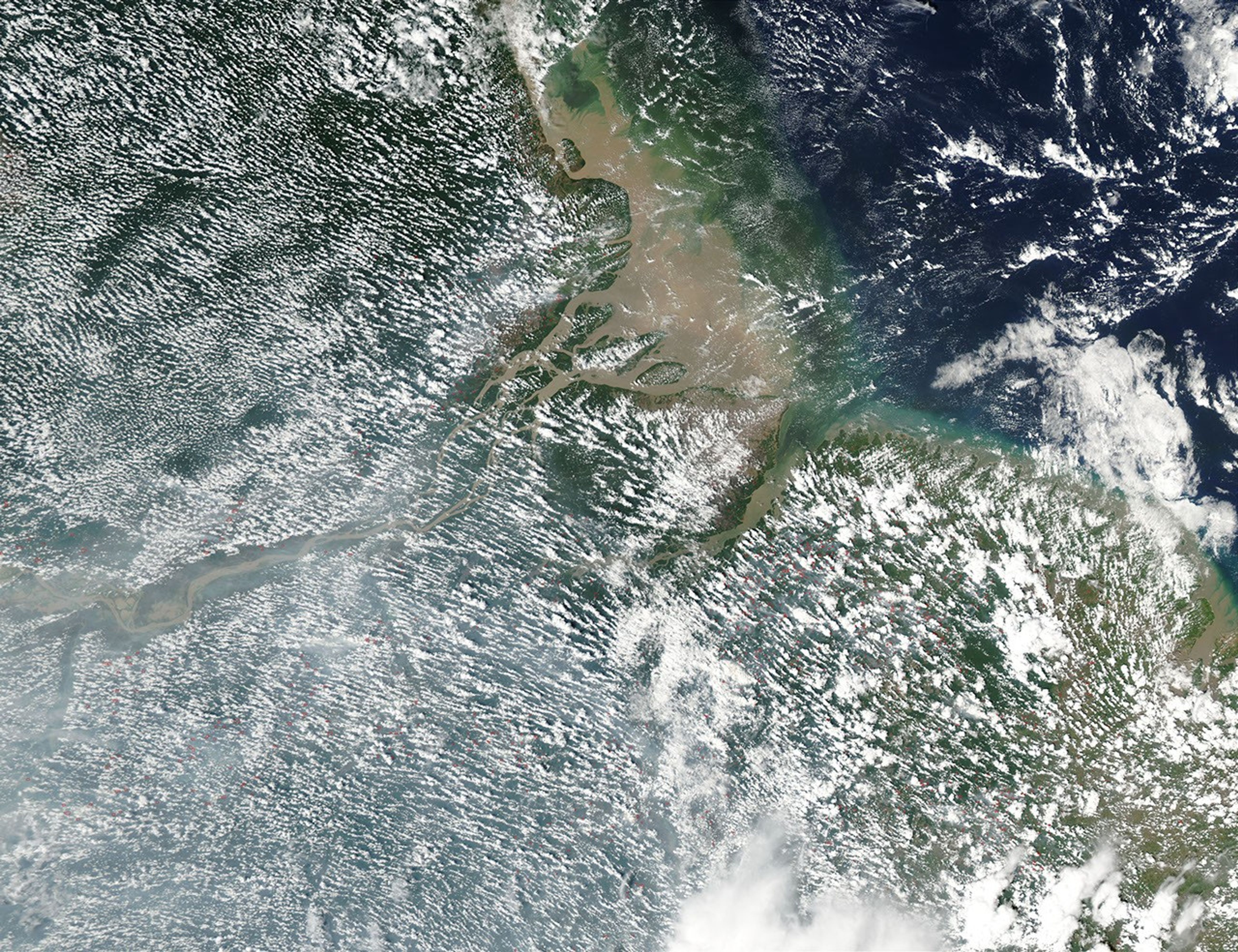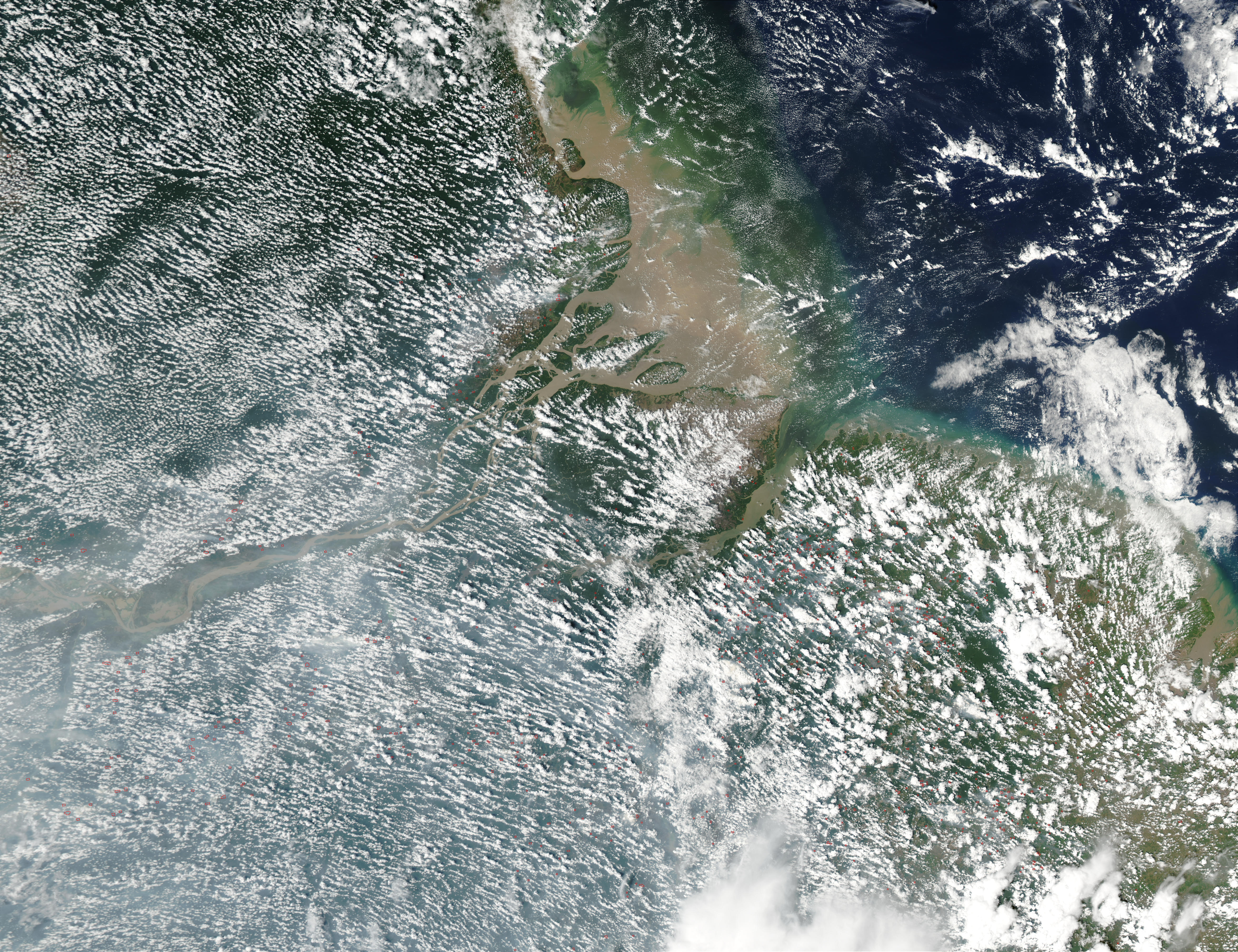 In northeastern Brazil, the dry season is coming to a close with scores of fires (red dots) crackling across the tropical landscape. This true-color Moderate Resolution Imaging Spectroradiometer (MODIS) image was captured by the Aqua satellite on November 24, 2002. In the bottom left is northeastern Brazil, over which hover repeating patterns of small, puffy clouds. The Atlantic Ocean is at upper right, and the tan-colored sediment from the Amazon River is swirling near the coastline. In roughly mid-December, the rainy season will begin and last until May.