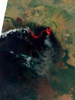 More recently, the volcano has eased into a quieter, lava-oozing phase, as shown in these images from the Advanced Land Imager (ALI) on the Earth Observing-1 (EO-1) satellite.The top image shows the volcano in visible and infrared light (shortwave infrared, near infrared, and green). The hot lava glows orange-red, fading to black as it cools. The long flow on the west side of the volcano is mottled with black, a sign that the surface is cooling. The lava to the east and south of the vent appears to be newer, since little of it has cooled. It is possible that the cooling lava in the western flow diverted the fresh lava to the south and east.