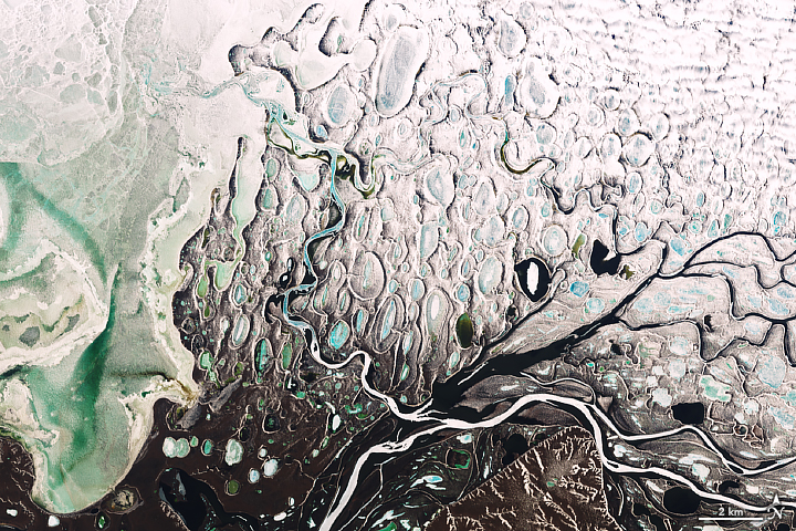 The second detailed image, also acquired June 4, shows the delta’s western side, where the modern, active part of the delta meets the older, drier parts. Water ponds in depressions in the ground formed from thawed permafrost. At the time of the images, these “themokarst lakes” remained frozen, but the delta will take on a completely different look soon.