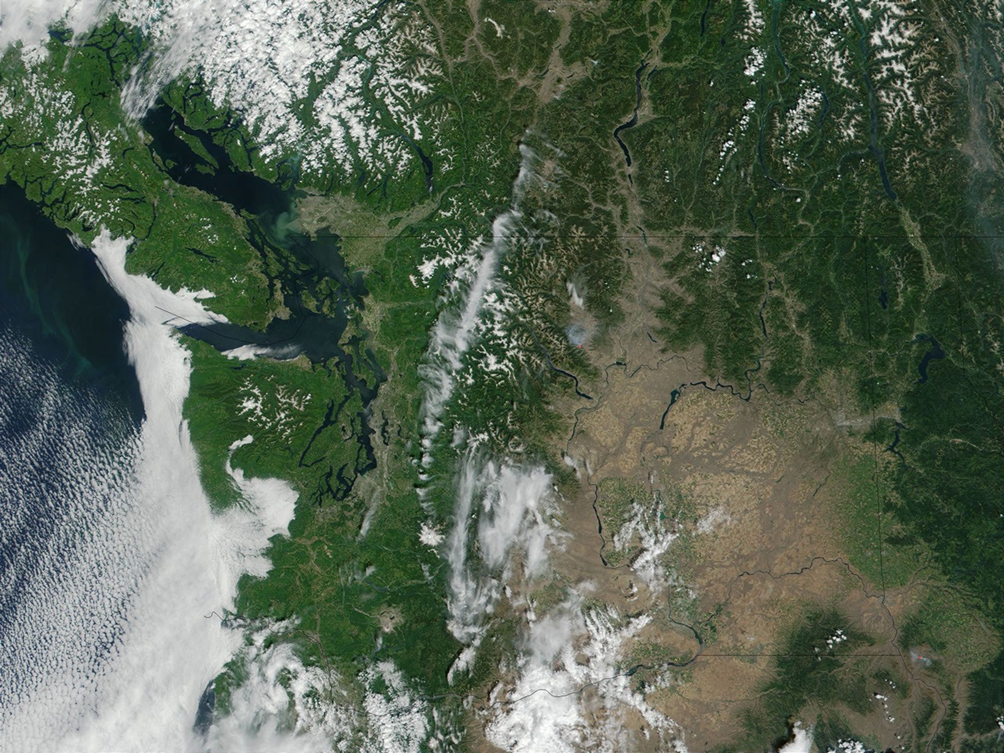Nearly all the areas in the full-size image, including Washington (center), Idaho (right), Oregon (bottom) are in a state of severe drought, which means the region could be in for another devastating fire season. Another fire is visible in Idaho in the full-size image just east of where Idaho borders with Washington and Oregon.