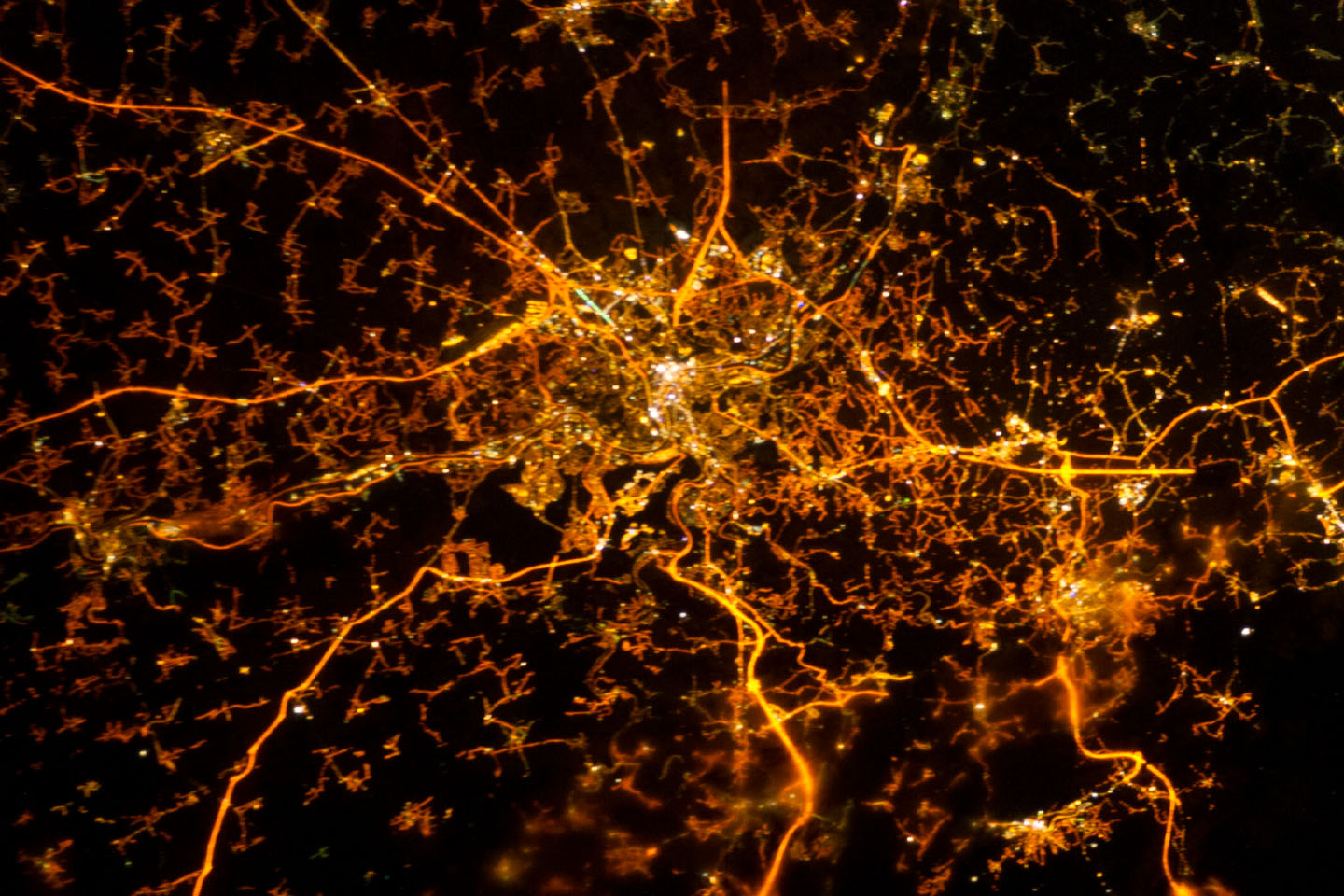To paraphrase an old expression: “all roads lead to Liège.” Or at least you could get that impression from this astronaut photograph. The brightly lit core of the Liège urban area appears to lie at the center of a network of roadways—traceable by continuous orange lighting extending out into the rural and relatively dark Belgian countryside. For a sense of scale, the distance from image left to right is approximately 70 kilometers (43 miles). The region to the southeast of Verviers includes agricultural fields and forest; hence, it appears almost uniformly dark at night.