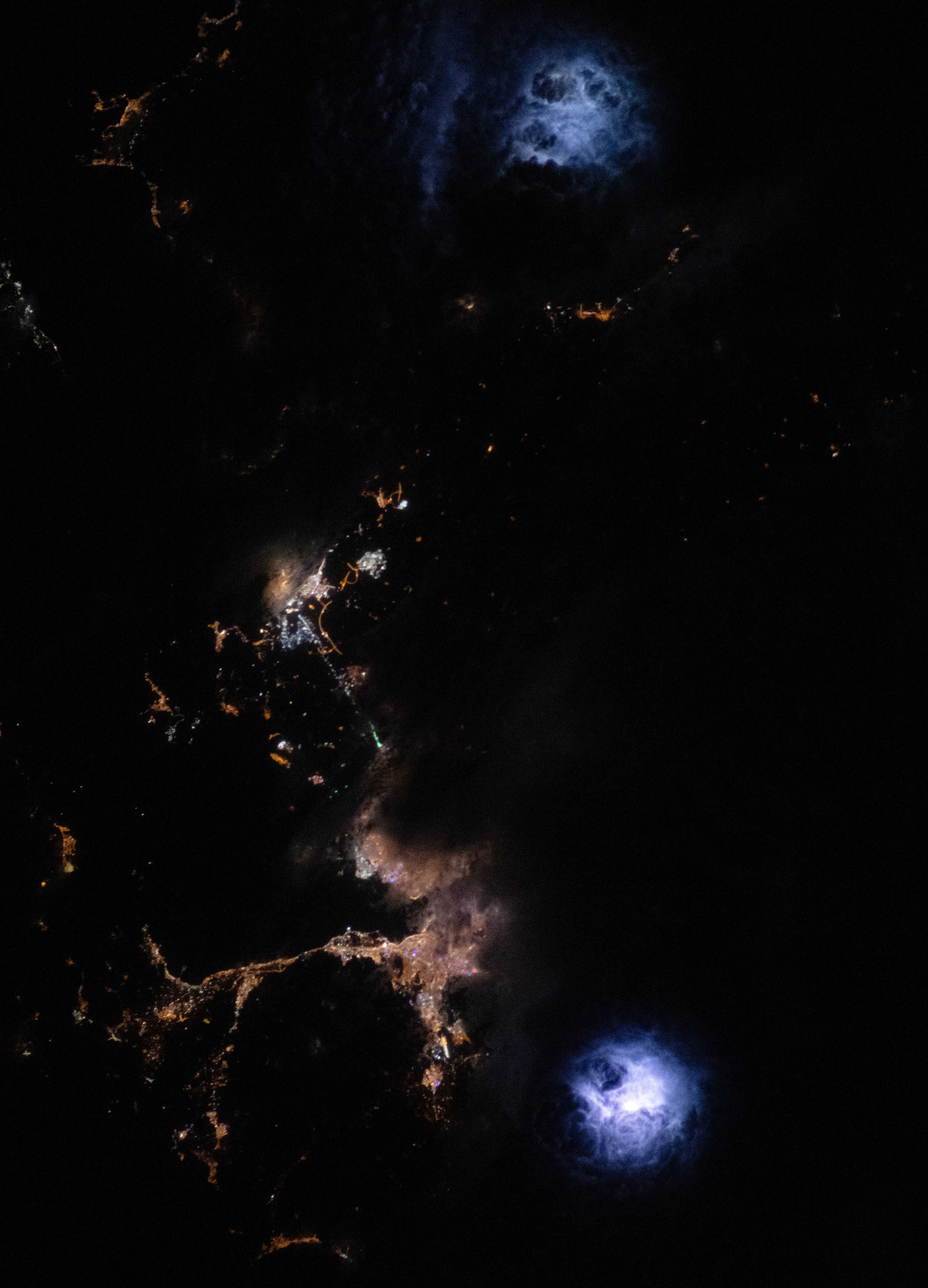 An astronaut aboard the International Space Station took this photograph of a thunderstorm at night over western Türkiye. The image highlights two distinct lightning flash areas, one southeast of the city of İzmir and the other north of Aliağa. Using a camera’s time-lapse function and the proper shutter speed, astronauts can capture photos of the bright flashes amidst the clouds while simultaneously documenting nearby nighttime lights from cities and highways.