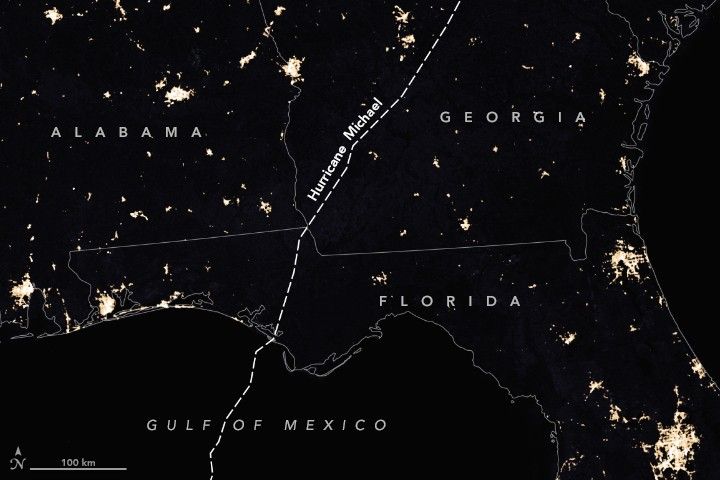 After making landfall as a category 4 storm on October 10, 2018, Hurricane Michael knocked out power for at least 2.5 million customers in the southeastern United States, according to the Edison Electric Institute. These images of nighttime lights in Florida, Georgia, and Alabama come from the Suomi NPP satellite and were acquired on October 6 and October 12, 2018.