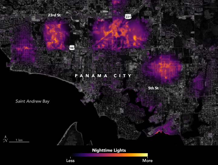 The second pair of images is a data visualization of where lights went out in Panama City, Florida. A team of scientists from NASA’s Goddard Space Flight Center processed and corrected the raw data to filter out stray light from the Moon, fires, airglow, and any other sources that are not electric lights. Their processing techniques also removed other atmospheric interference, such as dust, haze, and thin clouds. The images show conditions on October 6 and October 12, 2018.