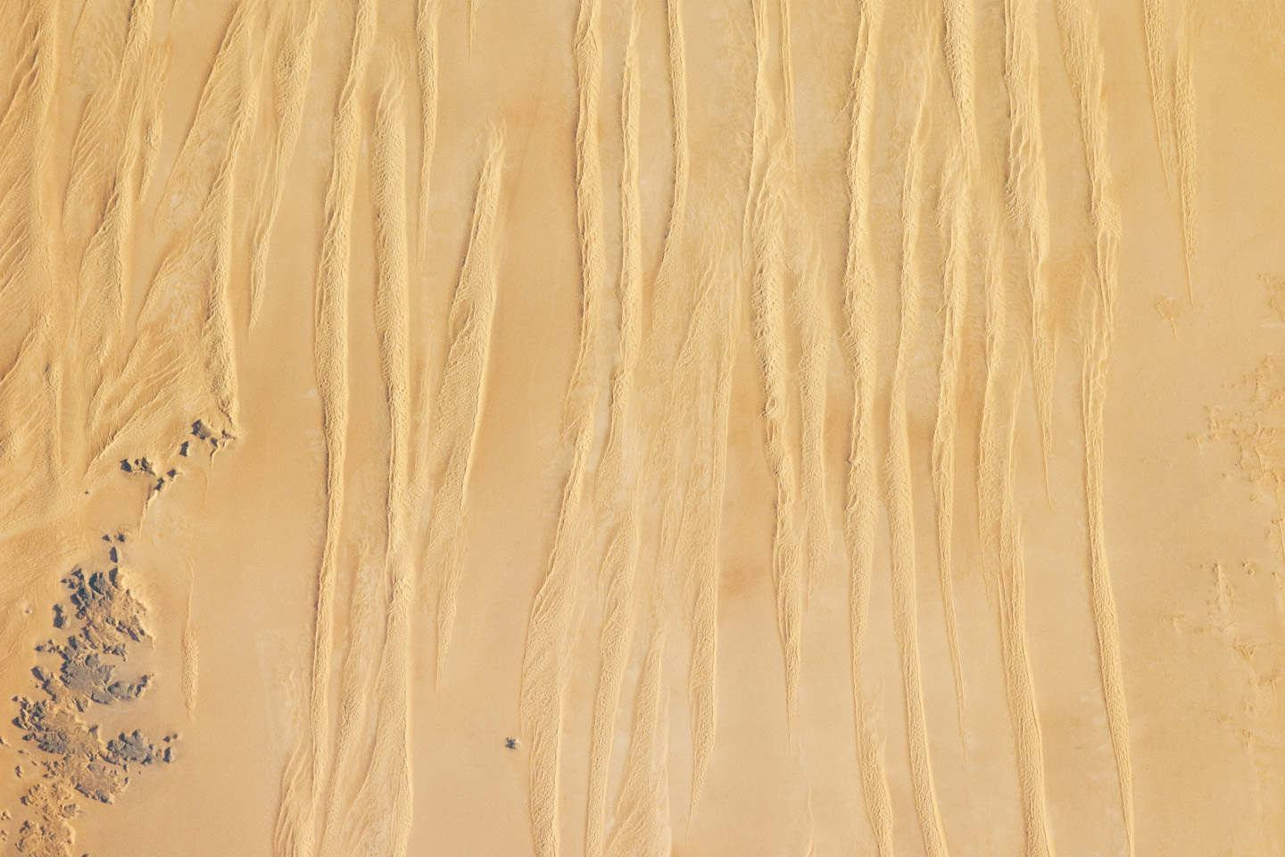 The dark rock outcrops at image lower left stand above the surface by as much as 150 meters. North winds have been deflected around this high zone, and smaller secondary linear dunes appear along the left side of the image, aligned with local winds that become ever more northeasterly as they approach the outcrops. A dune-free zone on the protected downwind (south-southeast) side of the outcrop gives a sense of the sand movement.