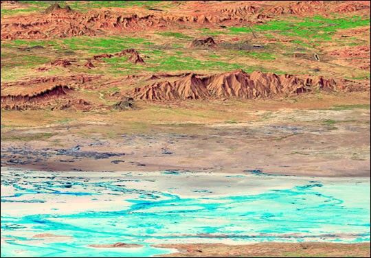 That part of the Kachchh region which lies north of the Kachchh MainlandFault includes the Banni Plains and the Rann of Kachchh. It is a low,flat basin characterized by salt pans and mud flats. The salt forms inthe Rann of Kachchh as mineral-laden waters evaporate. The salt flatscan be seen in the nadir images as highly reflective, white and grayareas. During the earthquake, strong shaking produced liquefaction inthe fine silts and sands below the water table in the Rann of Kachchh.This caused the mineral grains to settle and expel their interstitialwater to the surface. Field investigations have found abundant evidenceof mud volcanos, sand boils, and fissures from which salty ground watererupted over an area exceeding 10,000 square kilometers. Evidence of theexpelled water can also be seen on the MISR images.