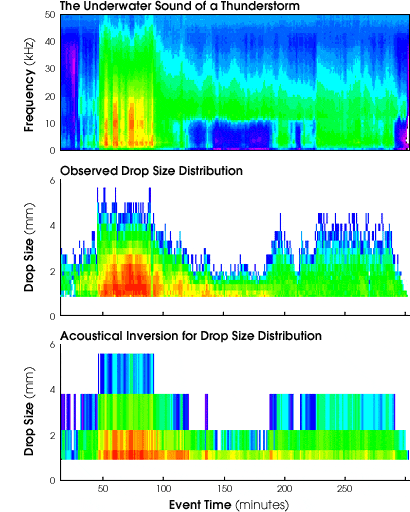 Because the sound signatures for each drop size are unique, it is possible to invert the underwater sound field to acoustically estimate the drop size distribution within the rain. Once an acoustic drop size distribution is obtained, a variety of interesting features associated with the rain can be calculated, for example, rainfall rate or median drop size.The observed drop size distribution in the thunderstorm and the acoustical inversion based on the unique sound signatures for each drop size. Very large raindrops are present during the heavy downpour. During the following drizzle, only small and medium raindrops are present and the sound of drizzle is heard between 13–25 kHz. Still later, a few large raindrops are present and the sound levels below 10 kHz become higher once again.
