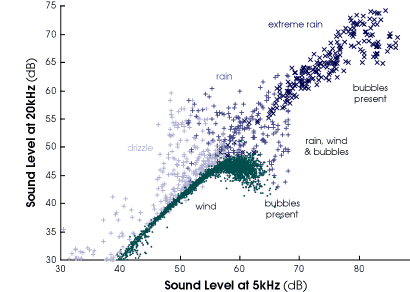 Using the graph above, the differences between wind-only and rain-generated spectra often appear to be subtle. However, by presenting the data in a different manner (below), acoustic identification of different weather conditions becomes apparent. The sound of rain and drizzle contains relatively more high frequency sound than the sound from wind-only conditions. Furthermore, rain is much louder. Even drizzle, under low wind speed conditions, has sound levels which can be orders of magnitude louder than wind-only conditions. The characteristic sound of drizzle, the 13-25 kHz peak, is sensitive to wind and has not been detected when the local wind speed is more than 8-10 m/s. On the other hand, the sound from heavy rain is very robust and can be detected even in very high wind speed conditions (over 20 m/s) (Nystuen and Farmer 1989). Extreme rain (over 100 mm/hr) is even louder, and can generate an ambient bubble layer that will distort the recorded sound spectrum.