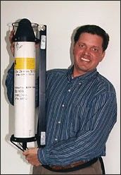 Dr. Jeffrey A. Nystuen holding an Acoustic Rain Gauge (ARG). This instrument is designed to be clamped onto an oceanic mooring and will record the underwater sound for one year. (Photograph courtesy Jeffrey A. Nystuen)
