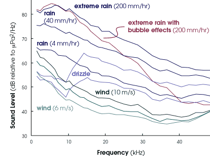 Using the graph above, the differences between wind-only and rain-generated spectra often appear to be subtle. However, by presenting the data in a different manner (below), acoustic identification of different weather conditions becomes apparent. The sound of rain and drizzle contains relatively more high frequency sound than the sound from wind-only conditions. Furthermore, rain is much louder. Even drizzle, under low wind speed conditions, has sound levels which can be orders of magnitude louder than wind-only conditions. The characteristic sound of drizzle, the 13-25 kHz peak, is sensitive to wind and has not been detected when the local wind speed is more than 8-10 m/s. On the other hand, the sound from heavy rain is very robust and can be detected even in very high wind speed conditions (over 20 m/s) (Nystuen and Farmer 1989). Extreme rain (over 100 mm/hr) is even louder, and can generate an ambient bubble layer that will distort the recorded sound spectrum.