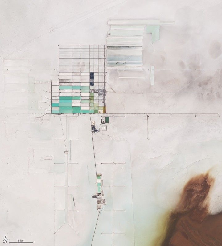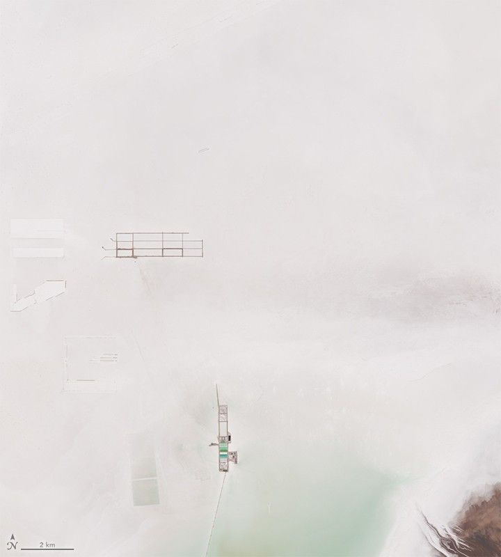 Landsat satellites began to detect evidence of buildings and evaporation ponds in the southern end of the salt flat in 2011. The Operational Land Imager (OLI) on Landsat 8 acquired the first image above on April 12, 2013. Nearly six years later, the size of the facility had grown significantly. The image below is a zoomed-out version of the more recent image.