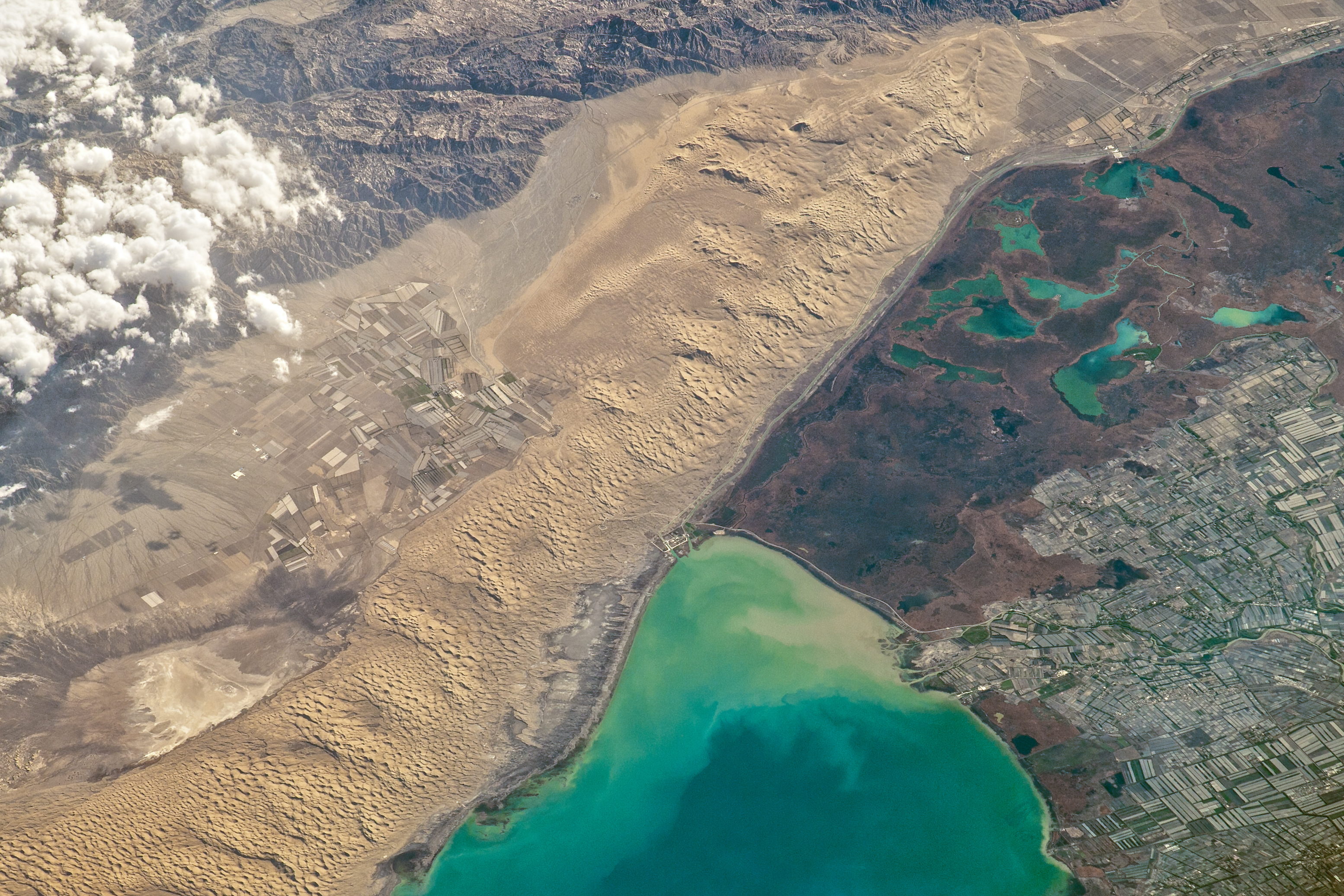 Orbiting over the deserts of Asia, a crew member aboard the International Space Station (ISS) used a 400 millimeter lens to capture an unusual mix of desert dunes and dense populations. A major cordon of dunes dominates this oblique view. The dunes form the shoreline of Bosten Lake in China’s far northwest. Even in this desert region, rain and snowfall in the Tien Shan Mountains (immediately to the north) generate enough water to support the small but dense population (55,000 people). (Note that north is to the lower right in this image.)