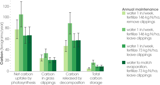 Recognizing that different people and businesses treat their lawns differently, she had a computer simulate the effect on the water cycle and carbon cycle of different lawn management techniques. The variables the models tested included watering a fixed amount (including rainfall) versus watering according to weather and evaporation rates, adding different amounts of fertilizer, and leaving the clippings on the lawn after mowing or bagging them up.
