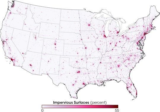 Milesi and her colleagues combined the information about the distribution of urban areas from the U.S. Geological Survey’s National Land Cover Database, which is based on Landsat satellite data, with nighttime city light data, which are collected by a Department of Defense satellite, and analyzed and made publicly available by the National Ocean and Atmospheric Administration. It turns out that the brightness of nighttime lights in an area is a good indication of how much impervious surface there is. That isn’t surprising when you think about where we put lights in a city—along roads, sidewalks, and in and around buildings.