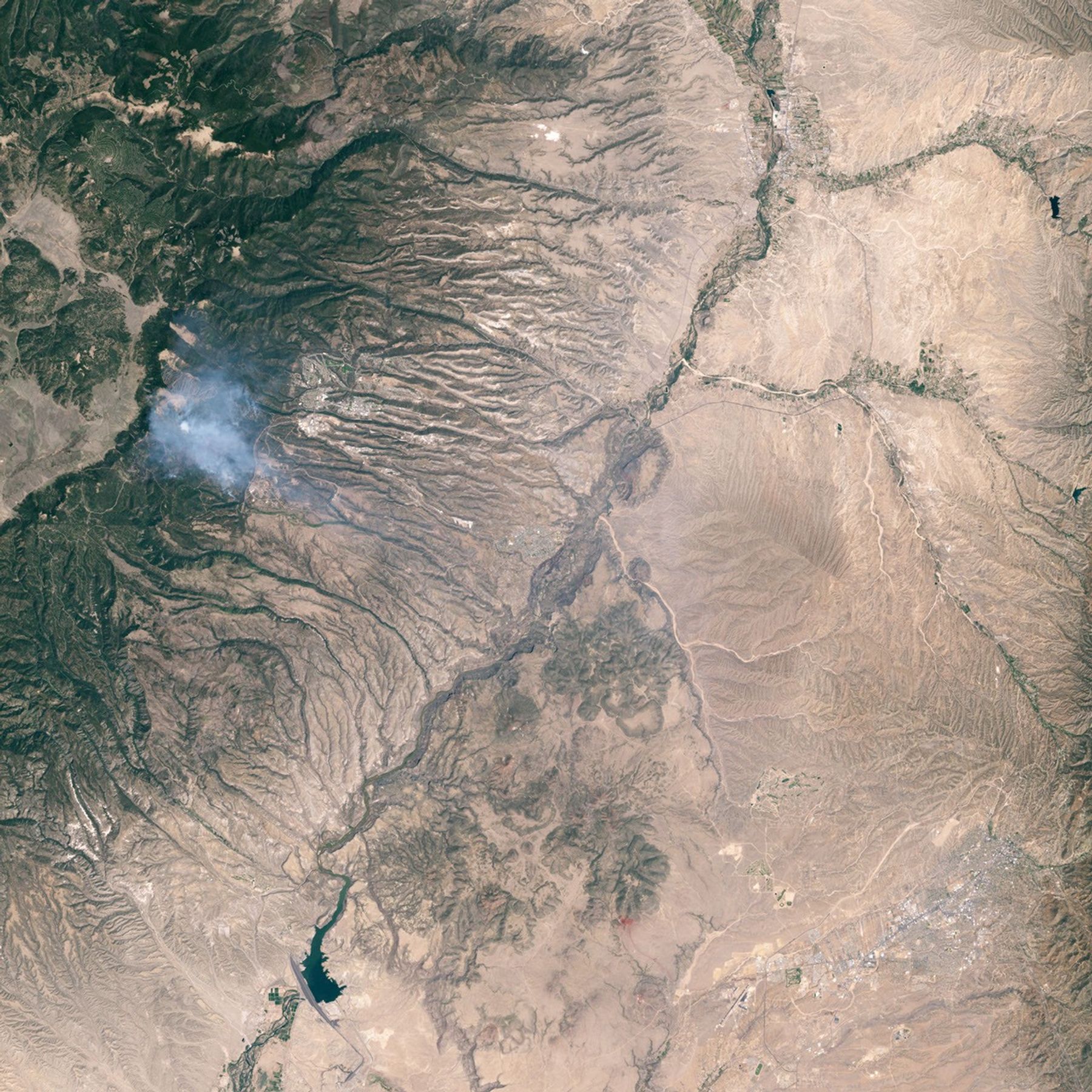 On May 9, 2000, the Landsat 7 satellite acquired an image of the area around Los Alamos, New Mexico. The Landsat 7 satellite acquired this image from 427 miles in space through its sensor called the Enhanced Thematic Mapper Plus (ETM+). Evident within the imagery is a view of the ongoing Cerro Grande fire near the town of Los Alamos and the Los Alamos National Laboratory.