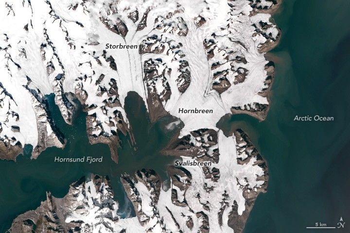 One area Pelto has focused on is the Hornsund Fjord region in Svalbard, a remote Norwegian archipelago in the Arctic Ocean. The shallow fjord nearly divides the large island of Spitsbergen into two separate islands. Fourteen tidewater glaciers flow into the fjord, and all of them have retreated substantially during the past three decades. The Thematic Mapper (TM) on Landsat 5 captured a image (top) of Hornsund Fjord on August 20, 1990. The second image shows the same area on August 19, 2017, as observed by the Operational Land Imager (OLI) on Landsat 8.