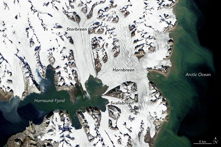 Since the water where Storbreen terminates is quite shallow, Pelto is confident that the glacier is retreating because rising air temperatures are driving the snow line higher up the glacier. In 1990, the snow line sat at an elevation of 400 meters. In 2013, 2014 and 2015, it has averaged about 500 meters. The center of Storbreen’s terminus has retreated nearly 6 kilometers (4 miles).