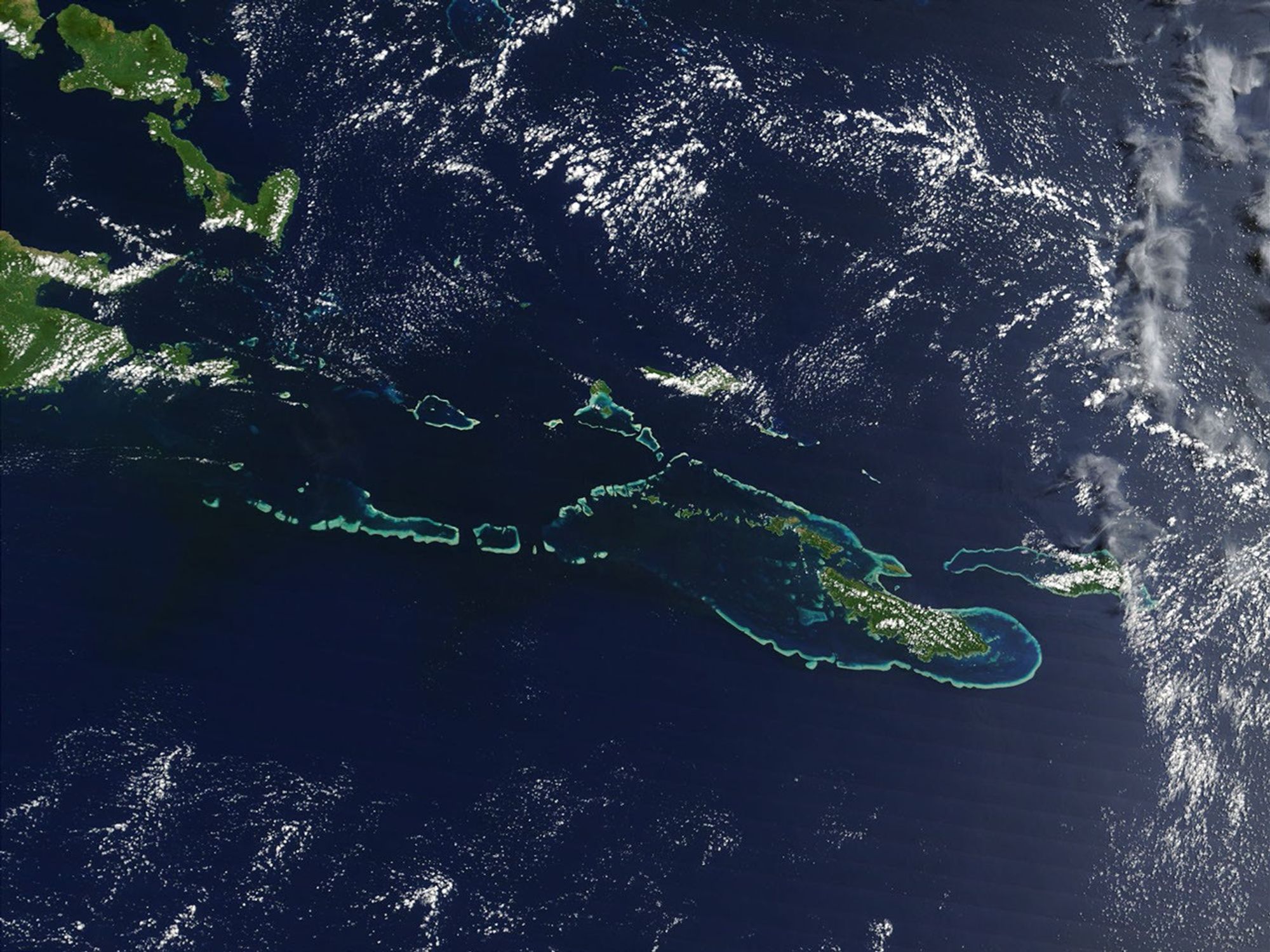 Off the southeast tip of Papua New Guinea lies a string of small volcanicislands and coral reefs collectively called the Louisiade Archipelago. Thistrue-color MODIS image from September 11, 2002, is centered on the islandchain, with Papua New Guinea at the left edge. Moving westward from easternend of the chain are the islands of Rossel and Tagula. (Misima Island, whichharbors the largest village in the region, is obscured by a patch of cloudsnortheast of image center.) To the north of the chain lies the Solomon Sea,and to the south is the Coral Sea. Most of the undisturbed land is coveredby tropical rainforest, and despite their small size, the islands harbor anumber of plant and animal species found nowhere else.
