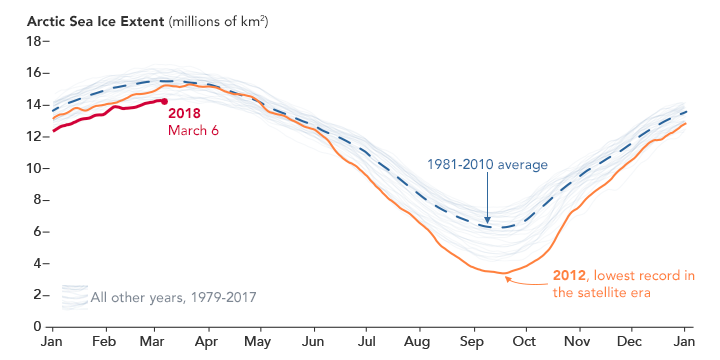 Arctic sea ice reaches its maximum extent each March, following months of growth during usually frigid and dark autumn and winter. The date of maximum extent for winter 2018 has yet to be determined, but in February 2018, the average ice extent was the lowest of any February on record.