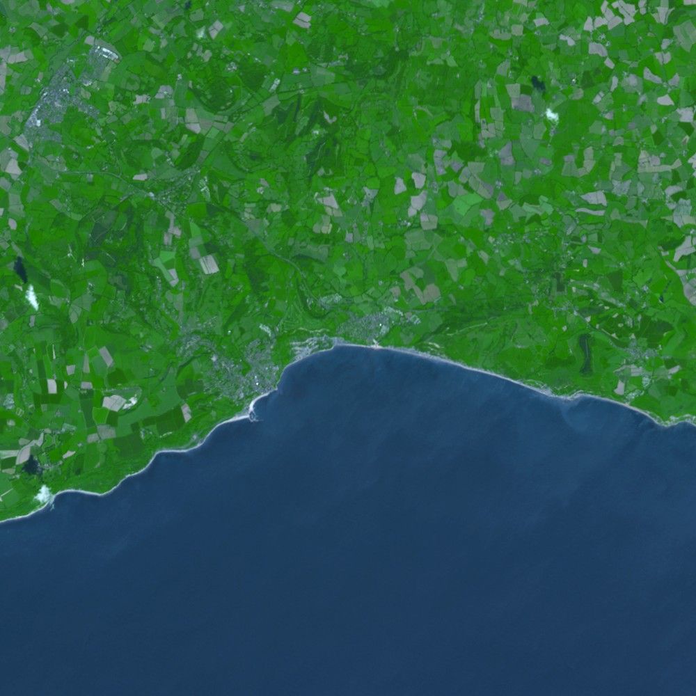 On June 5, 2007, the Advanced Spaceborne Thermal Emission and Reflection Radiometer (ASTER) on NASA’s Terra satellite captured this image of Lyme Regis and its surroundings. In this image, deep blue indicates water and green indicates vegetation. Bare ground and paved surfaces appear in shades of beige and gray. The landscape around the town is lush, interrupted by the occasional plot of cultivated land. The gray-hued town sprawls away from the coast in a spider-like fashion.