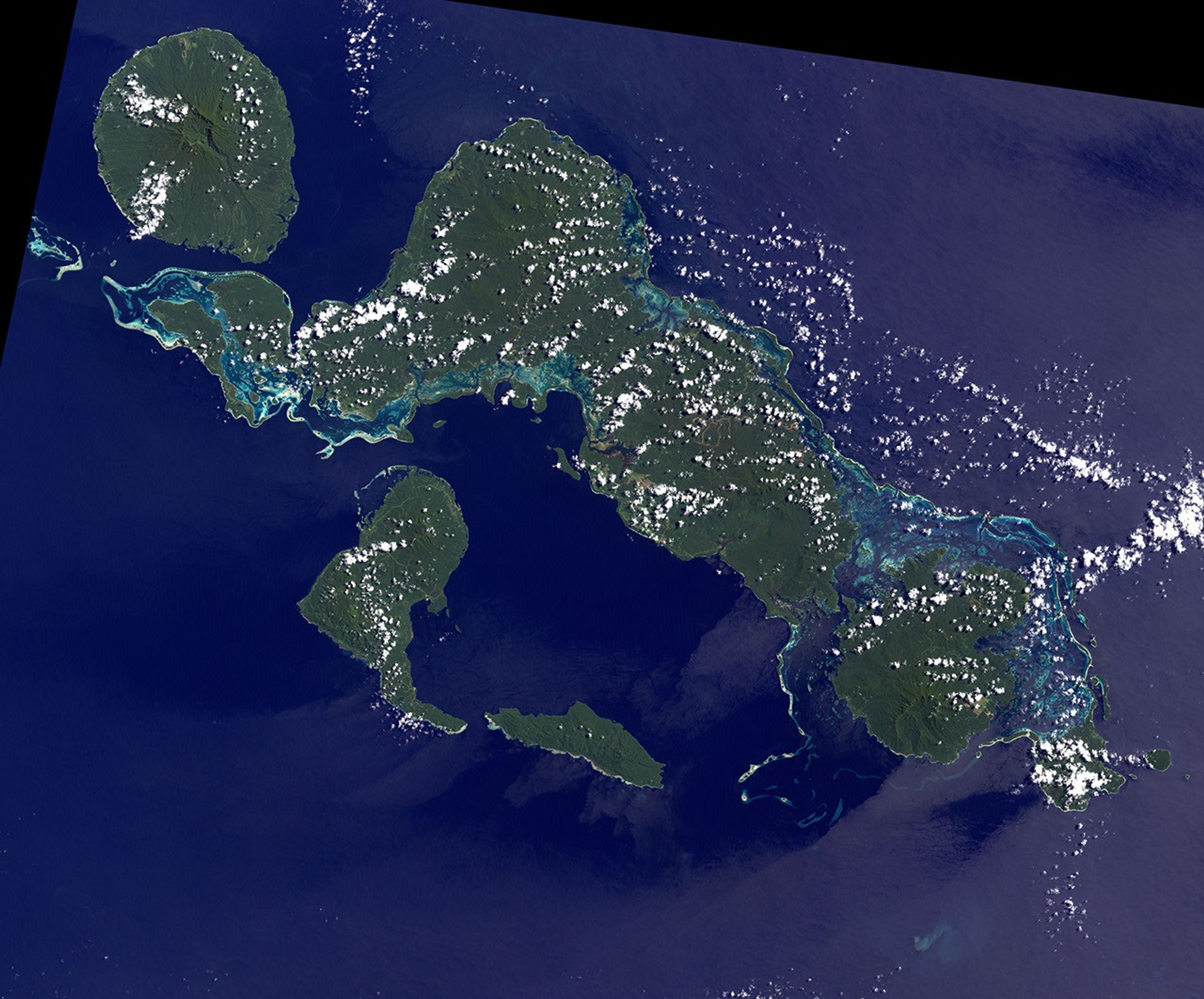 This image, captured by the Landsat-7 satellite, shows the location of the earthquake epicenter in relation to the nearest islands in the Solomon Island group. Gizo is beyond the left edge of the image, but its triangular fringing coral reefs are shown in the upper left corner. Though dense rain forest hides volcanic features from view, the very shape of the islands testifies to the geologic activity of the region. The circular Kolombangara Island is the tip of a dormant volcano, and other circular volcanic peaks are visible in the image. The image also shows that the Solomon Islands run on a northwest-southeast axis parallel to the edge of the Pacific plate, the section of the Earth’s crust that carries the Pacific Ocean and its islands.