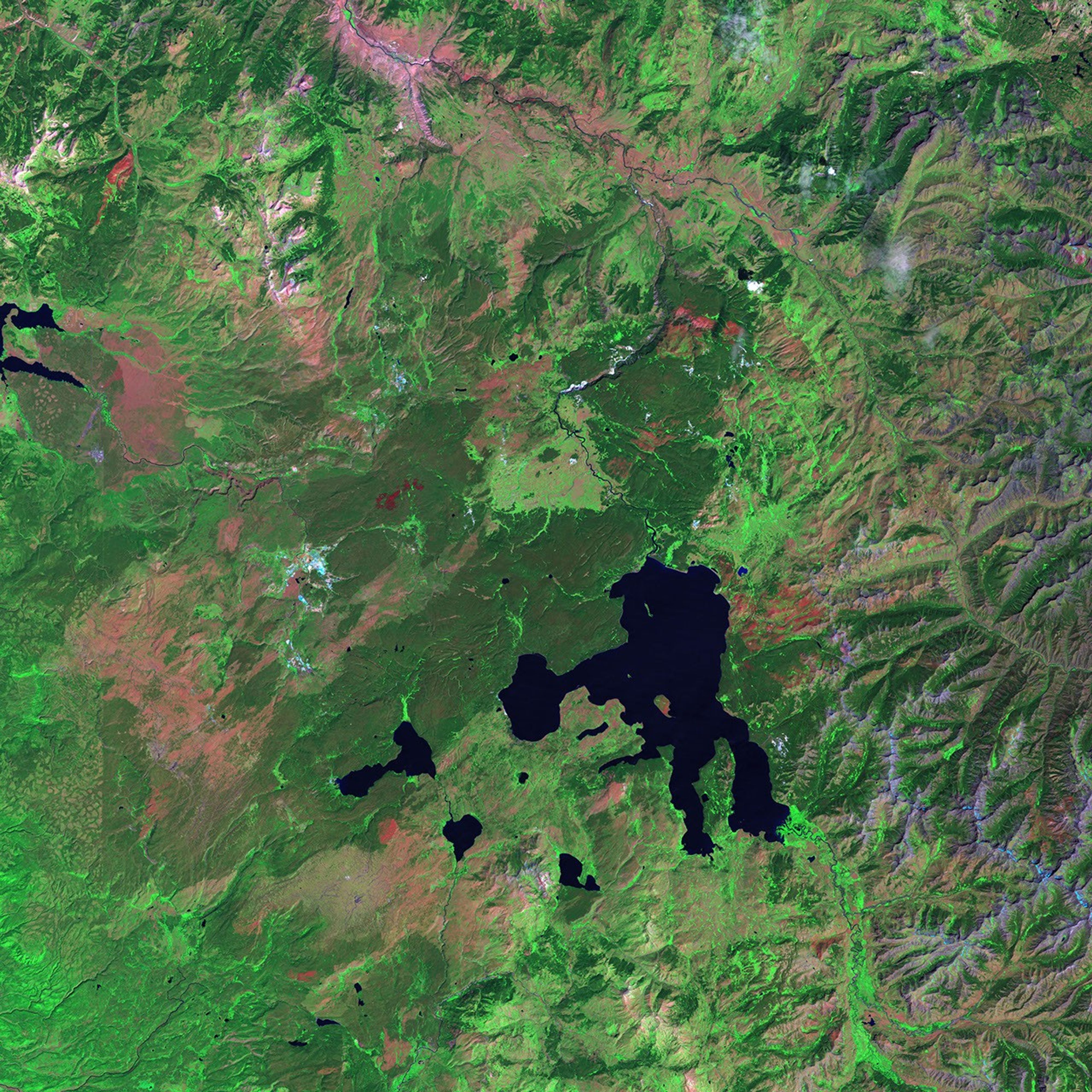 A deep red burn scar stretched across a remote section of Yellowstone’s Central Plateau on August 9, 2006, when the Landsat 5 satellite captured this image. The land was freshly charred by the Magpie Fire, which was still burning when the image was acquired. The fire was burning about seven miles east of Madison Junction (just beyond the left edge of the image) near the center of Yellowstone National Park. The fire burned through lodgepole-pine forest, the type of forest that covers 80 percent of the park. Around the fire, undamaged lodgepole-pine forest is dark green. In contrast, grasslands to the south and east of the fire are bright green. The grasslands surround Nez Perce Creek and other smaller waterways on the plateau. In the upper left corner of the image, a tan road follows the course of the Gibbon River. The road loops around the Central Plateau, connecting popular sites such as Old Faithful (southwest of the fire, just beyond the lower left corner of the image), Fishing Bridge, the Norris Geyser Basin, and Madison. The light pink land along the top left edge of the image is Monument Geyser Basin. The lighter green forest that surrounds the road is a mix of whitebark pine and Douglas fir trees.