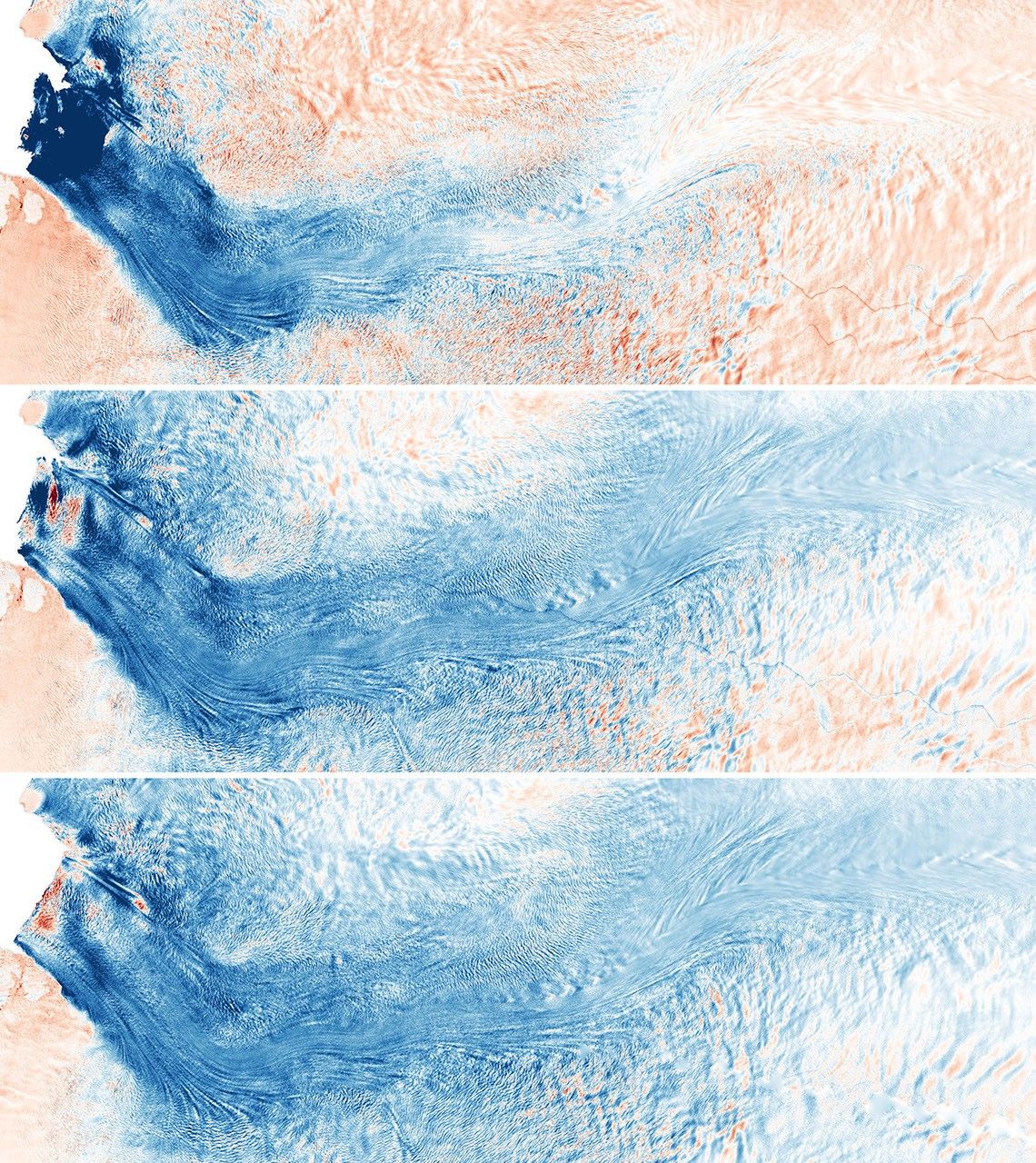 The maps above show how the glacier’s height changed between March 2016 and 2017 (top); March 2017 and 2018 (middle); and March 2018 and 2019 (bottom). The elevation data come from a radar altimeter that has been flown on research airplanes each spring as part of OMG. Blue areas represent where the glacier’s height has increased, in some areas by as much as 30 meters per year.