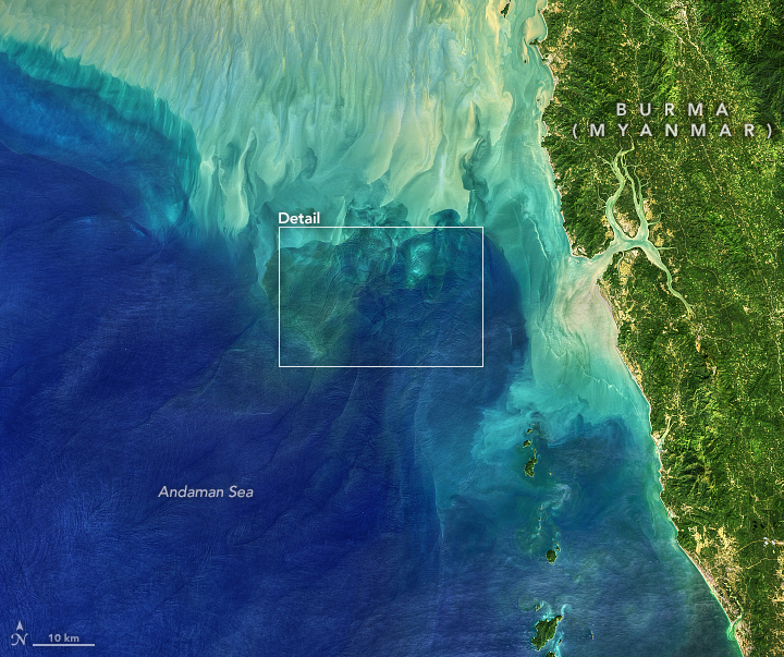 The Andaman Sea is known to sailors and scientists for its large internal waves, mostly because it has a diverse array of seafloor features. The Indian Ocean seafloor rises quickly from 3000 meters to 200 meters around the Andaman and Nicobar Islands, then drops again in the Andaman Sea. Within and around the sea, there are shallow ridges, reefs, and submarine banks. The area is also volcanically and tectonically active, so there are mountains on the seafloor. All of this rugged but out-of-sight topography alters the flow of water as it sloshes into and out of the basin.