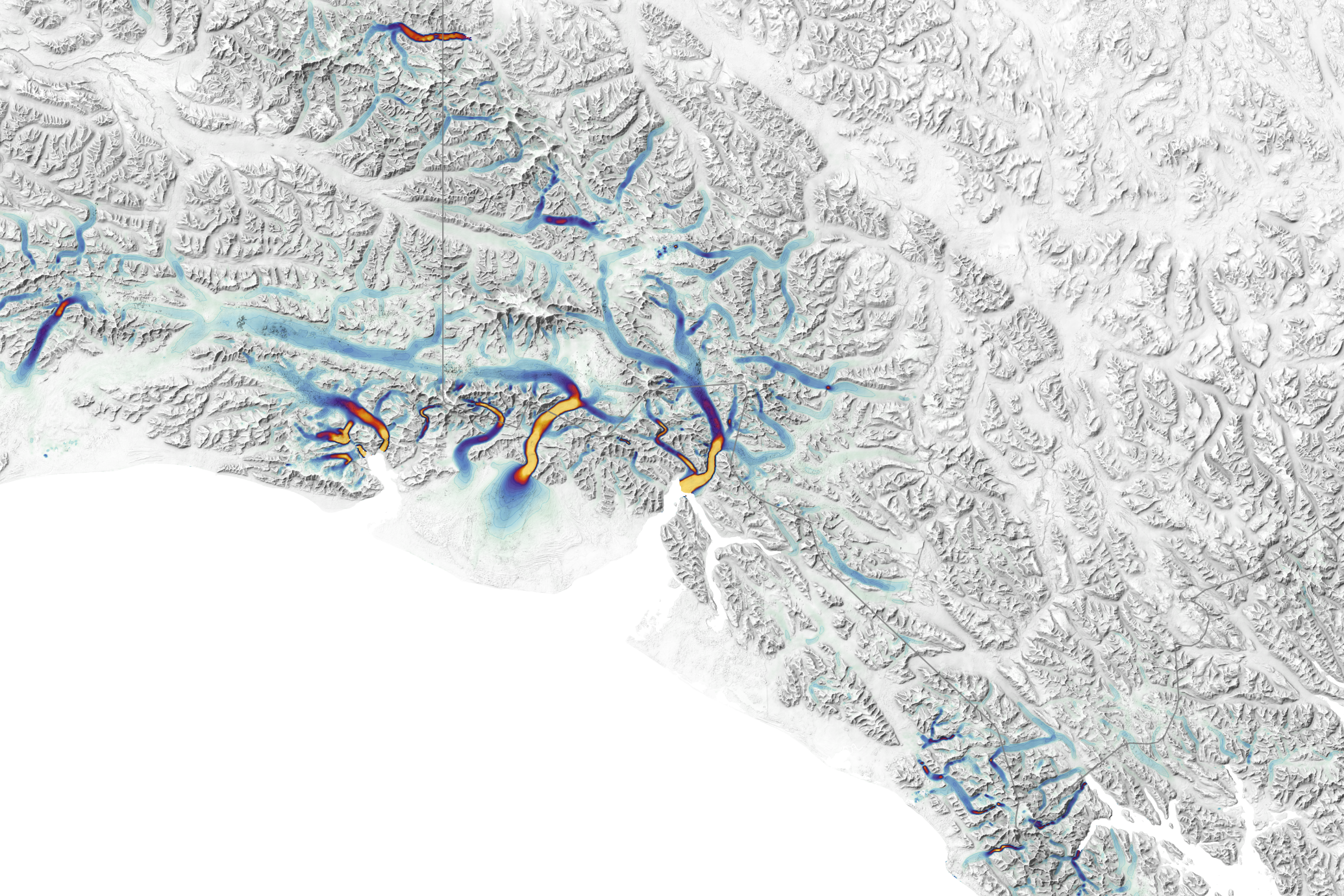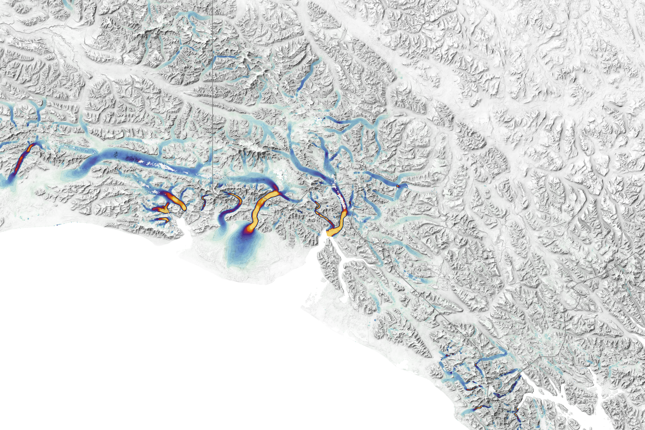The second set of images above are examples of the flow velocity maps that Gardner and colleagues can derive from ITS_LIVE data sets. Comparing velocities in 1997 with those of 2017, you can see that velocity changes along Malaspina are more subtle than for the trio of glaciers to the west, which appear to be surging.