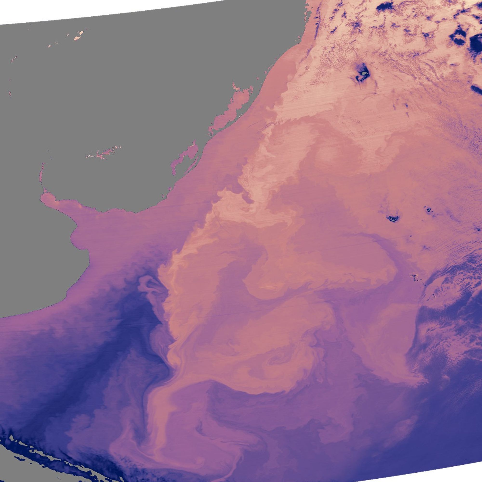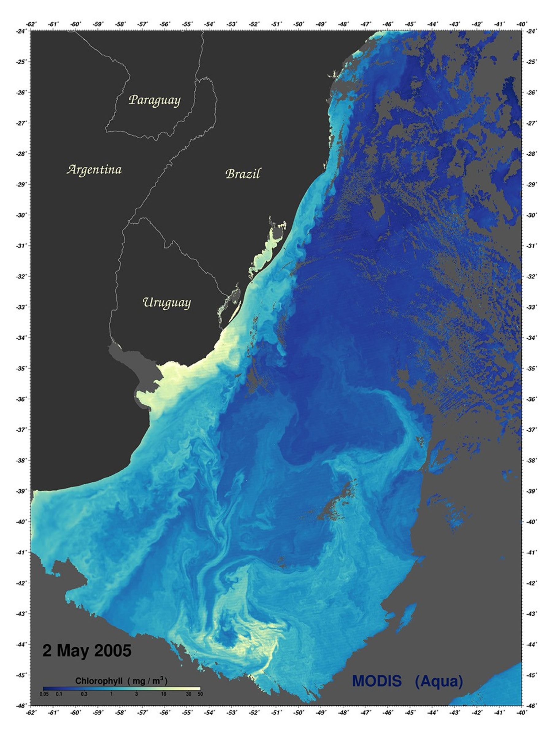 The dark blue icy finger of the Malvinas Current reaches north into the warm tub of South Atlantic Ocean in this sea surface temperature image. The current is an offshoot of the Circumpolar Current, the band of ocean water that circles Antarctica, and it carries frigid water north along the coast of South America until it encounters water pouring out of the Rio de la Plata between Argentina and Uruguay. Here, the cold Antarctic waters also meet the Brazil current carrying warm subtropical waters south, and the 20-degree boundary between the two currents forms a stark line in the top image. The image, and the chlorophyll concentration image that accompanies it, was acquired on May 2, 2005, by NASA’s Moderate Resolution Imaging Spectroradiometer (MODIS).