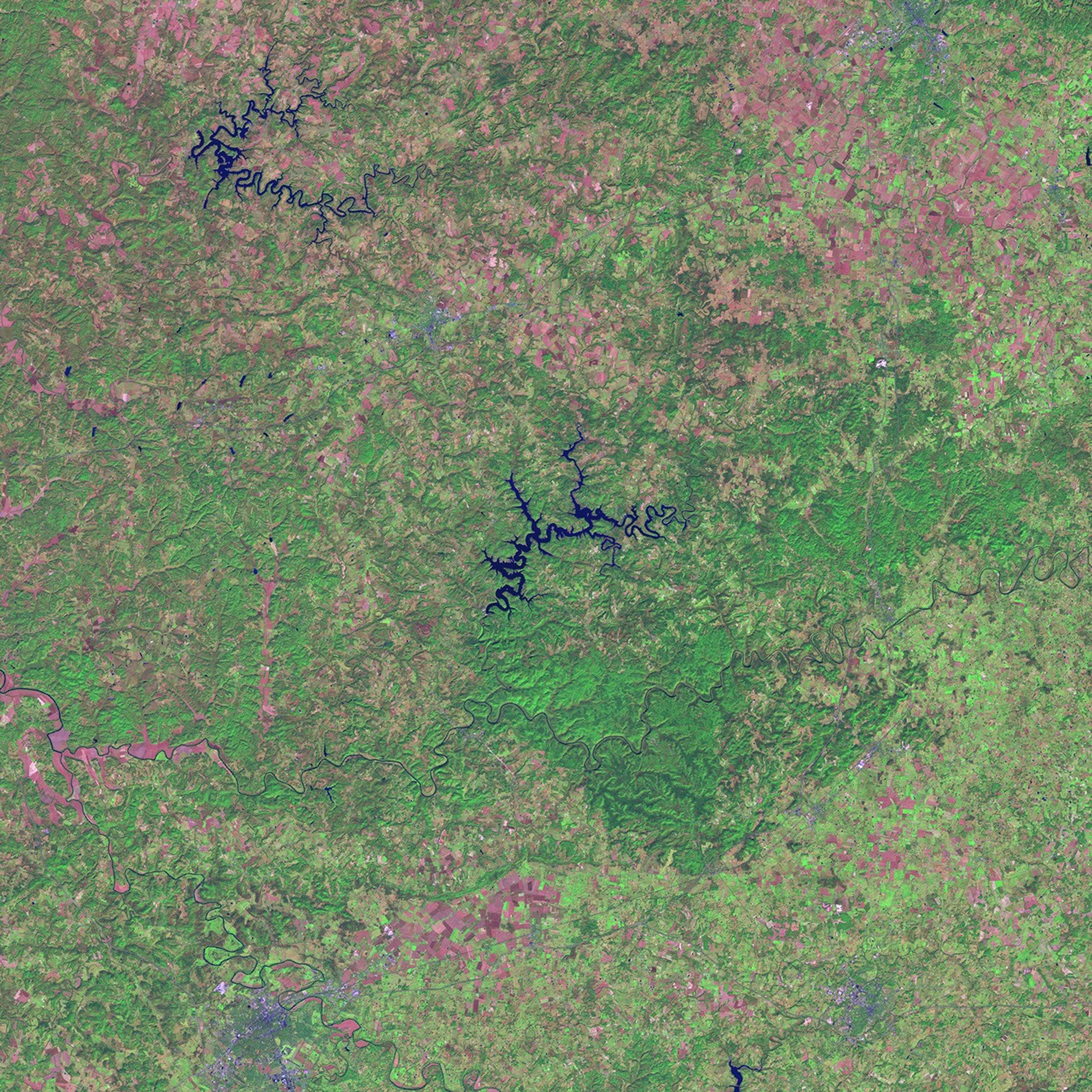 This Landsat image gives little hint of the vast caverns beneath the surface, even though the ecosystems above and below the ground are intimately connected. However, the image does show the striking difference between the protected parkland in the image center and the surrounding area. Green shows healthy vegetation, exposed land is pink, and concrete-based structures (roads, cities) appear in various tones of grey. The Green River runs through the middle of the parkland in deep blue. Beyond the park boundaries, the land surface changes character, with farmland and settled areas to the south, and smaller, valley-floor farms to the north. The deep blue, serpentine shape at upper left is the Nolin River Lake.