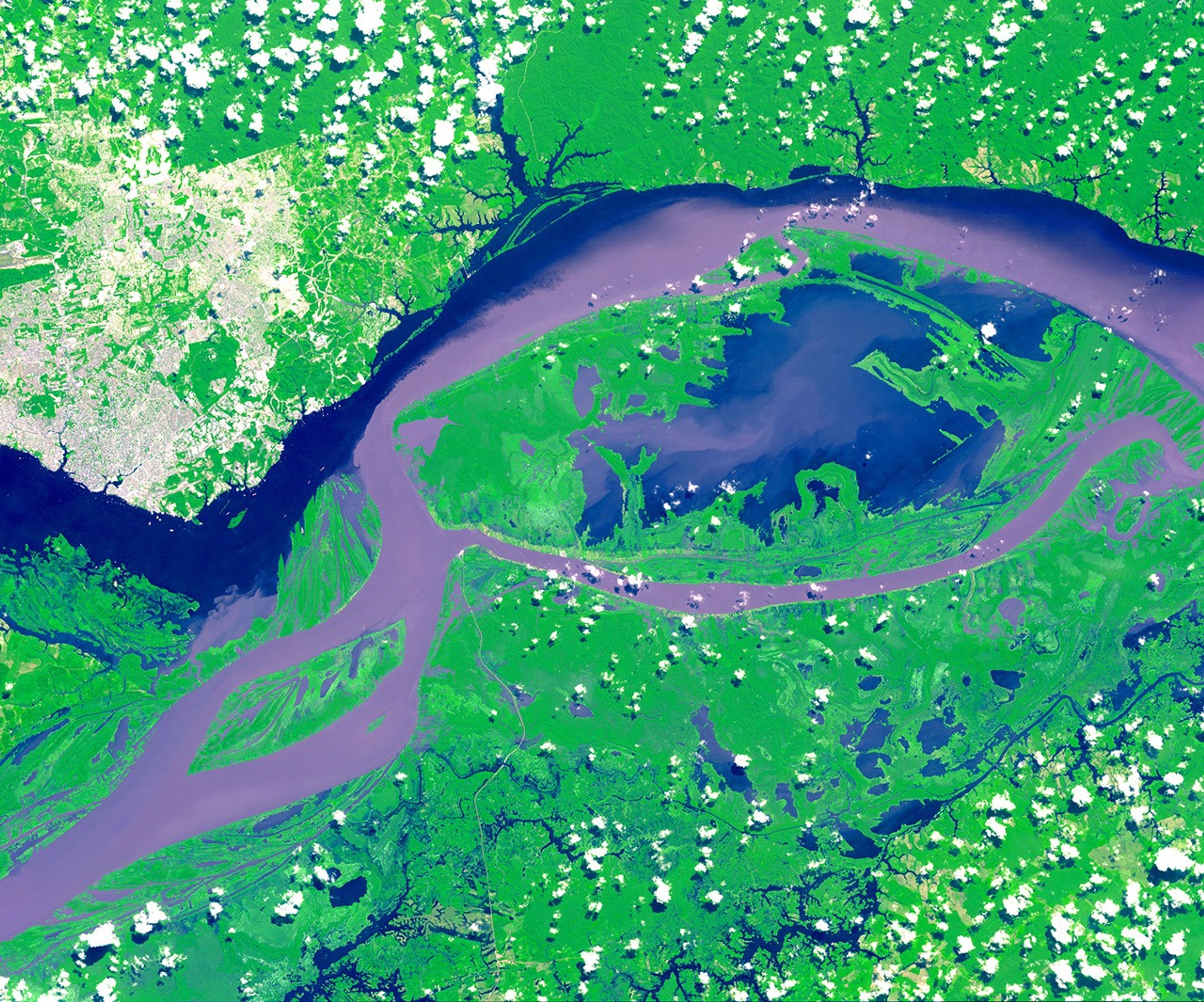 The above image was acquired by the Advanced Spaceborne Thermal Emissions and Reflection Radiometer (ASTER) aboard NASA’s Terra satellite and shows the junctions of the Amazon and Rio Negro rivers in Manus, Brazil. The Rio Negro flows 2300 kilometers (1400 miles) from Colombia to Brazil and appears dark blue in the image. The river gets its color from the high levels of tannin in the water. The waters of the Amazon River contain more sediment and appear purple and brown in the image. The city of Manus can be seen in the upper left-hand corner of the image. Manus is the capital of the state of Amazonas and has a population of one million.
