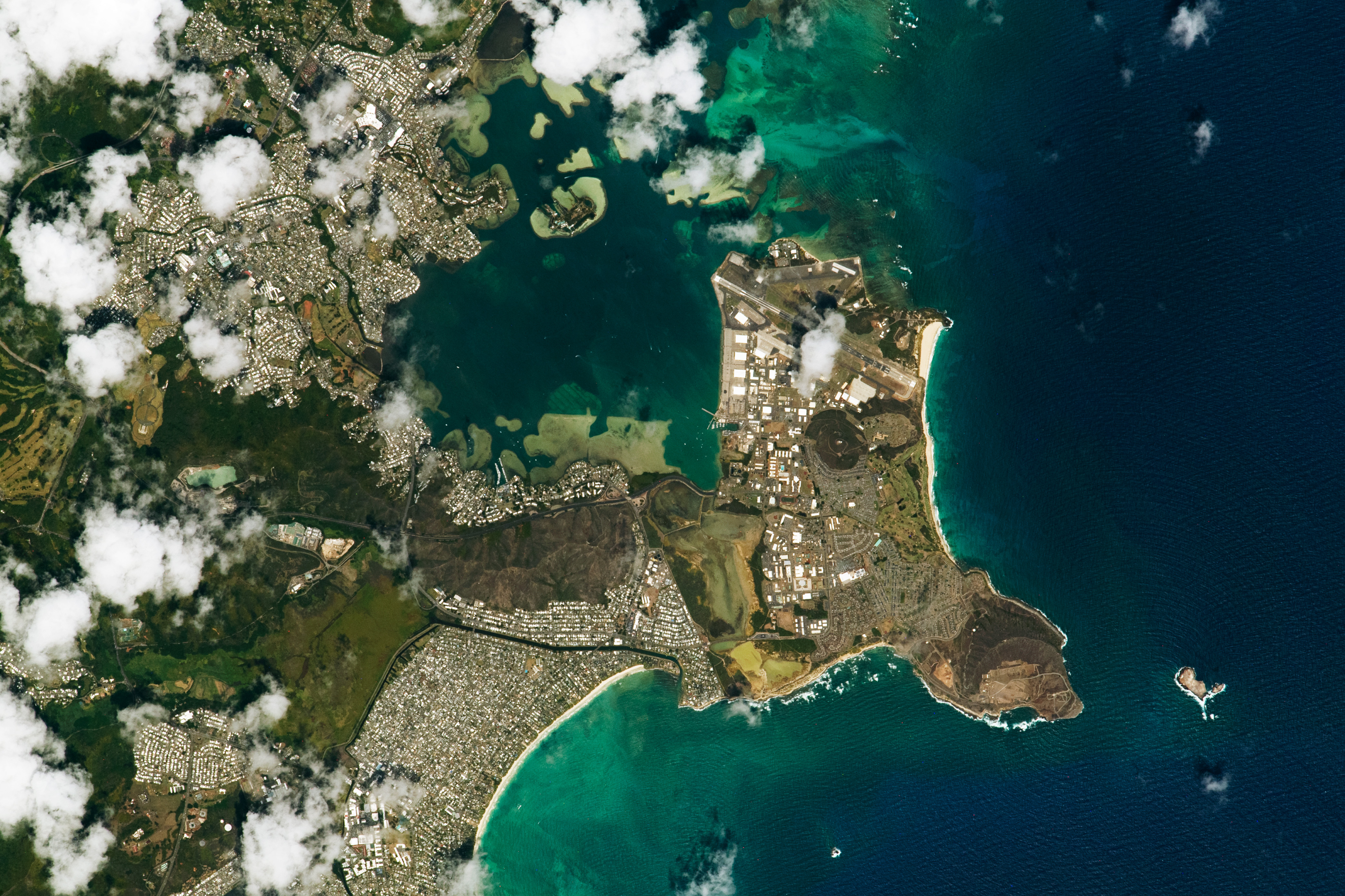 An astronaut aboard the International Space Station took this photograph of Mōkapu Peninsula along the east coast of O’ahu, Hawaii. O’ahu—the third-largest Hawaiian island—is also referred to as “the gathering place” due to the island’s large population of more than 876,000 people.