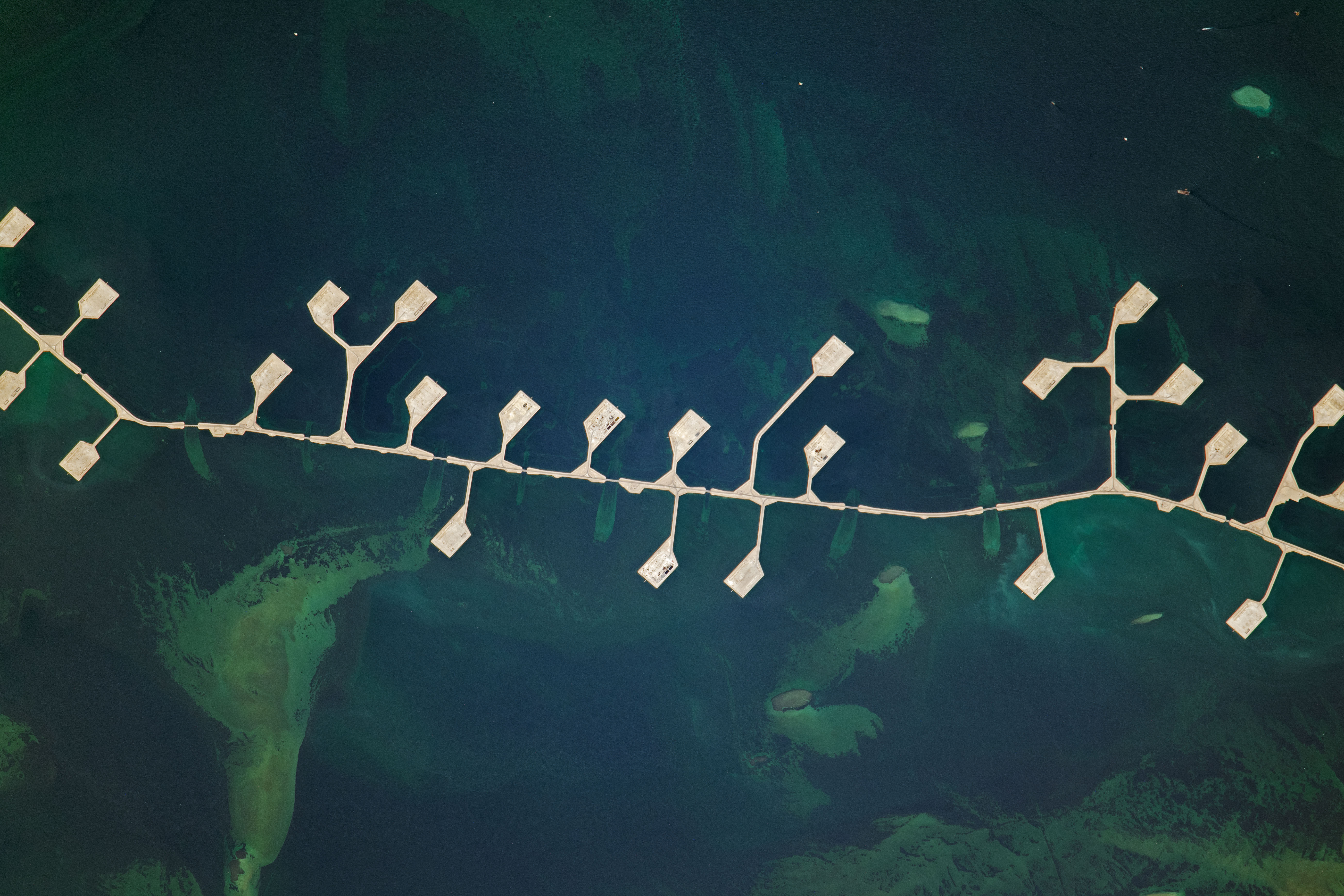 An astronaut aboard the International Space Station took this photo while orbiting over the Persian Gulf. The image shows the Manifa Field Causeway, a human-made development off the eastern coast of Saudi Arabia. The astronaut used a long focal-length lens to capture this detailed scene of blocky “island” structures against the blue-green waters.