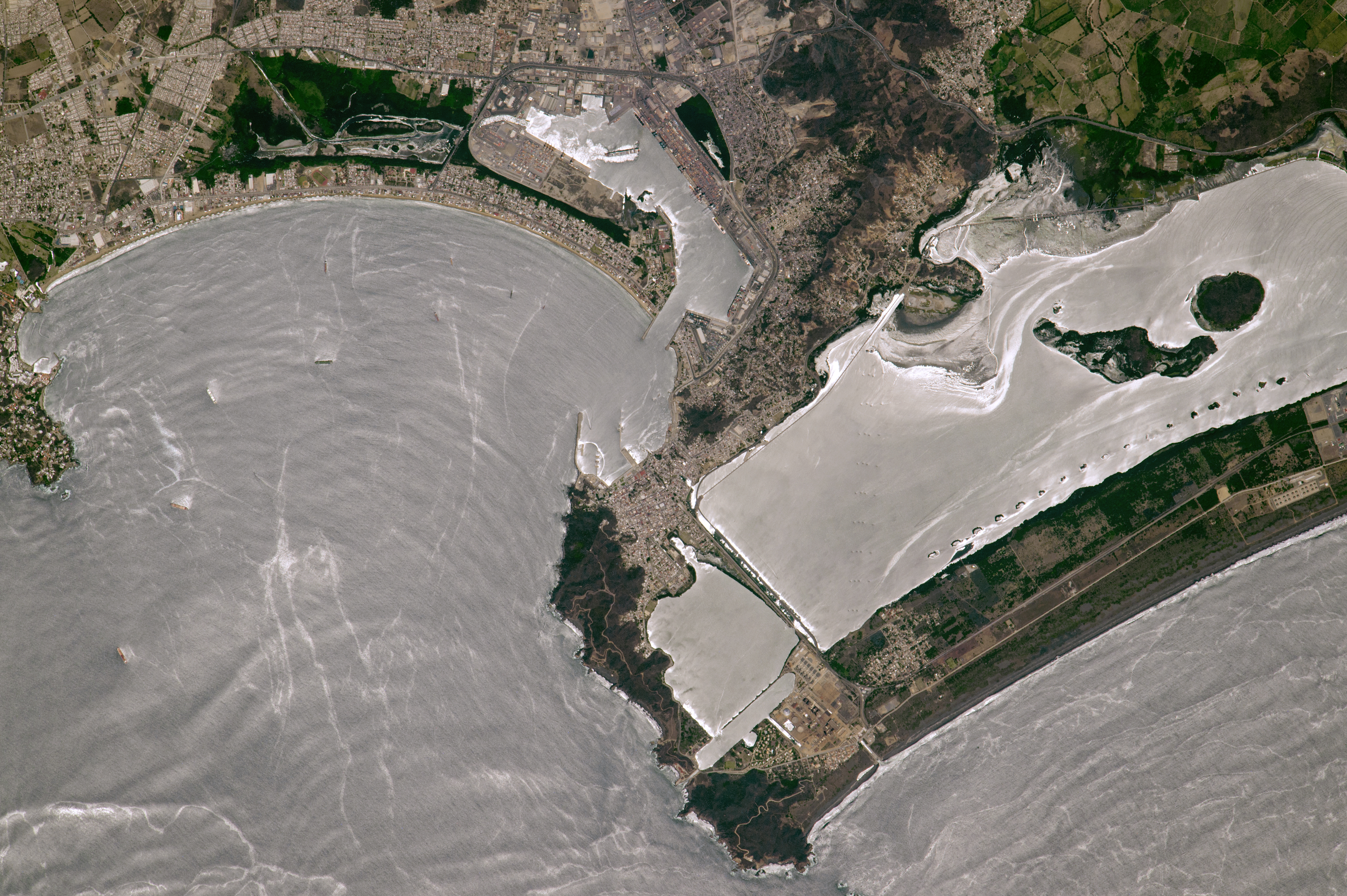 An astronaut took this photograph of Mexico’s busiest port—Manzanillo—from the International Space Station. The port handles cargo for Mexico City, which is 600 kilometers (400 miles) to the east. With a population of 185,000 people, the city spreads along a complex coastline. Numerous tourist hotels situated along a curved sand spit dot the seafront and the main beach.